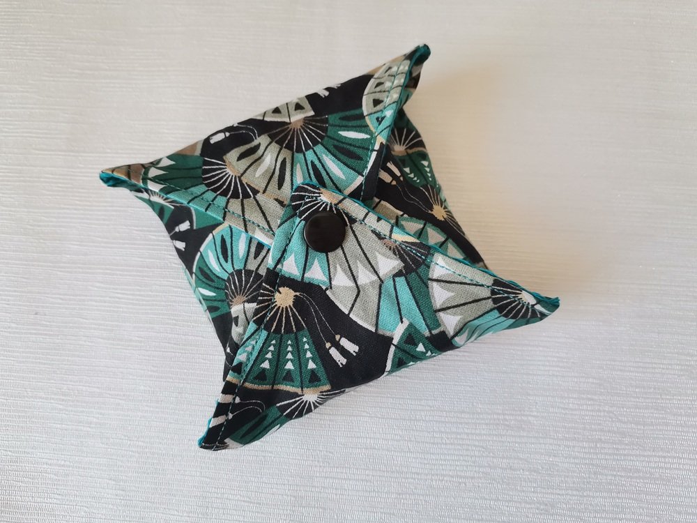 Très jolie pochette à savon ou shampoing solide qui se ferme à l’aide d’un bouton pression.
