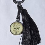Porte clés, idéal comme cadeau pour papa, composé d'un support porte clés en métal argenté orné d'un long pompon de fils noirs de 9 cm et d'un cabochon de résine de 25 mm avec inscription "Diplôme du meilleur papa au monde".