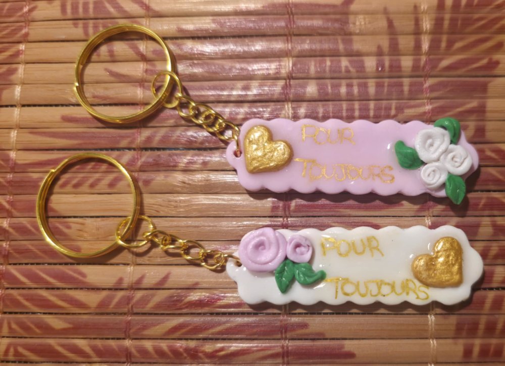 Ce duo de porte-clés en pâte polymère (Fimo), délicatement façonné à la main, symbolise l’amour éternel et les liens indestructibles.