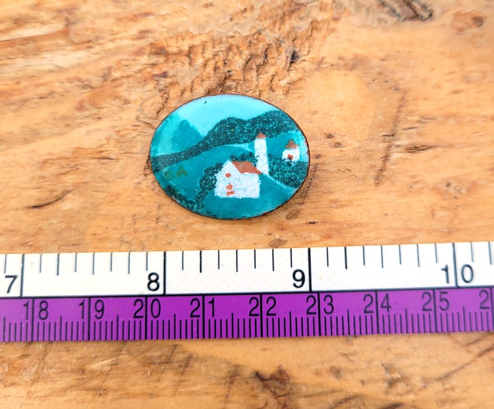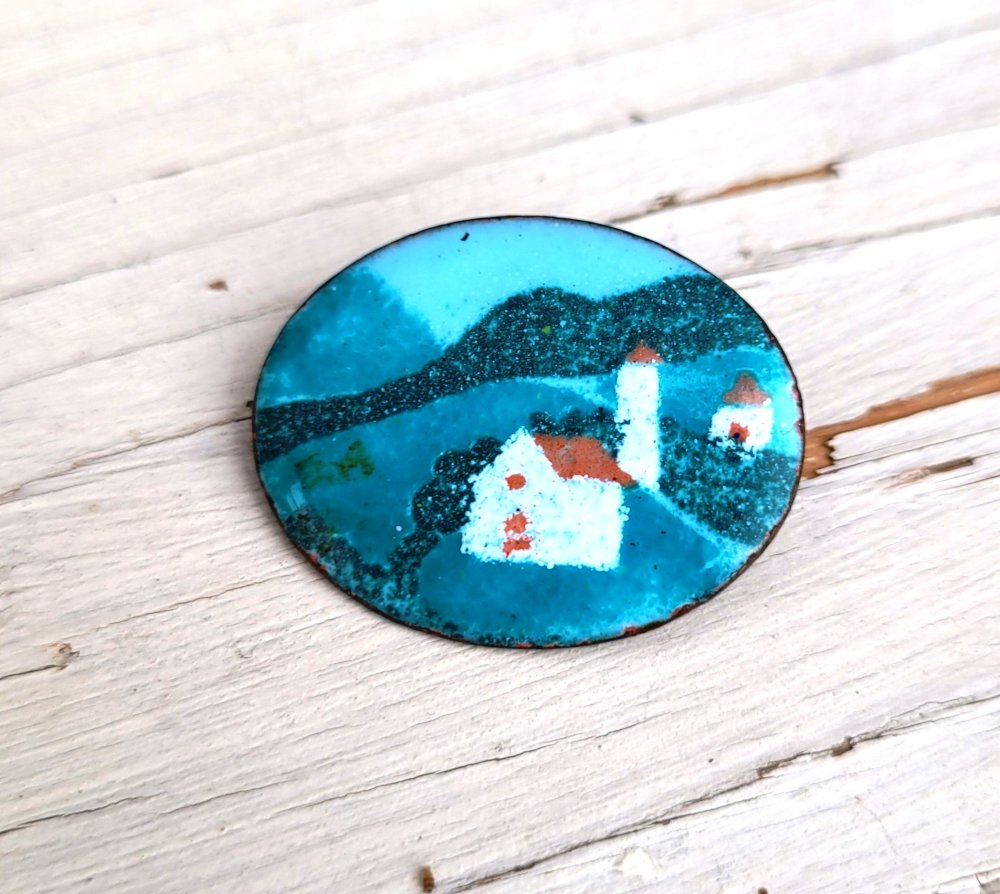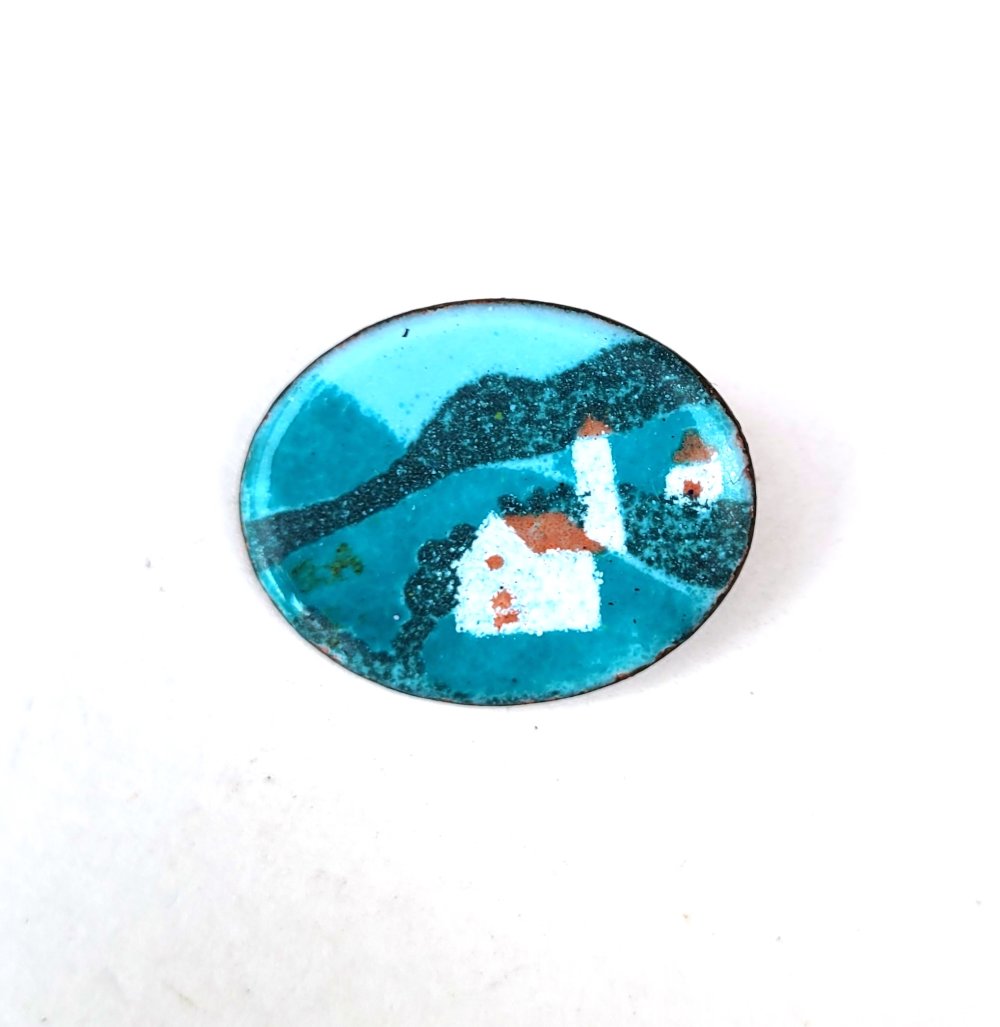 Une broche vintage ancienne avec breloque en émail , paysage de montagne - Alsace : un prix sympathique pour une belle occasion !!!