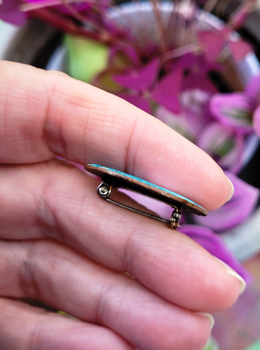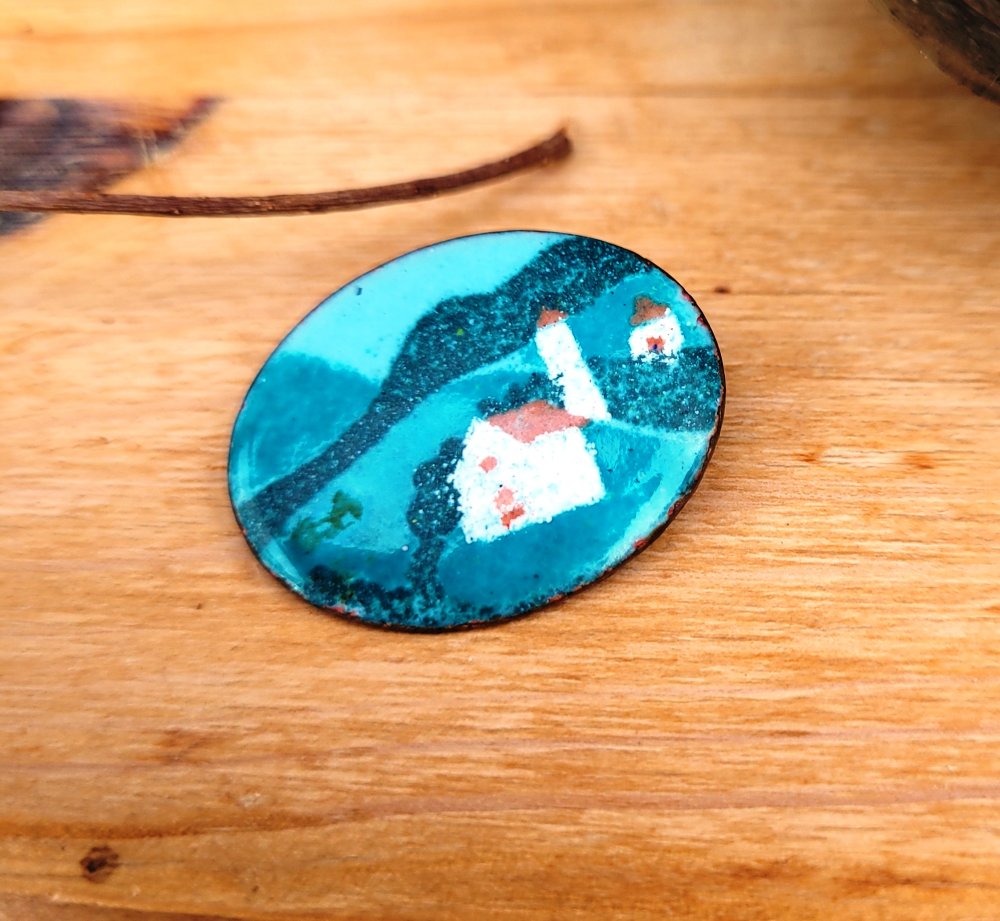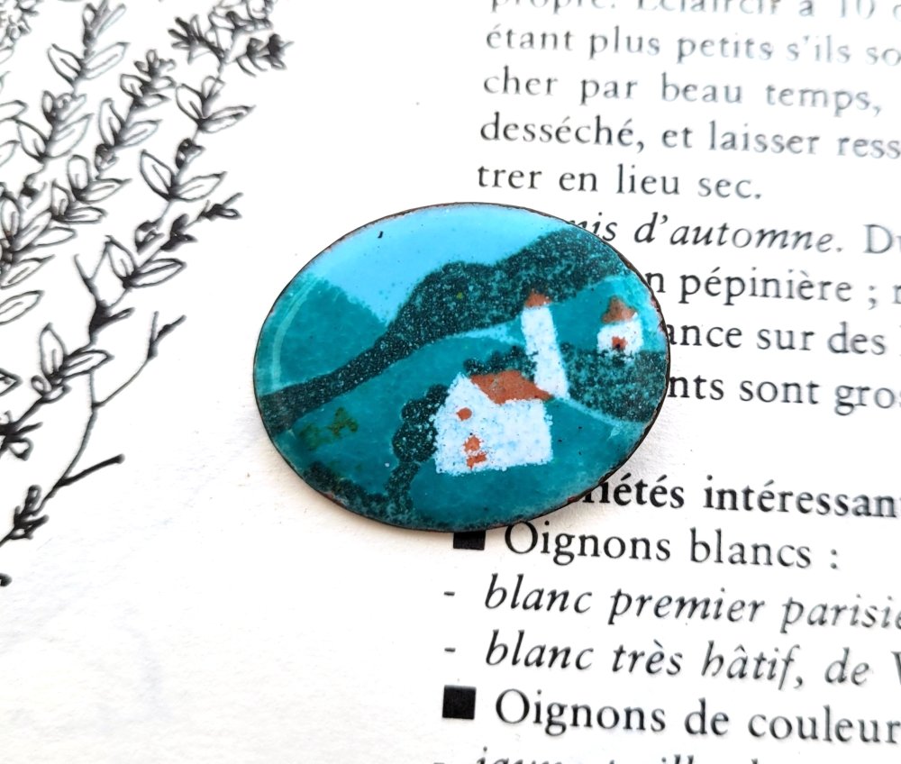 Une petite broche vintage ancienne avec breloque en émail , paysage de montagne - Alsace : un prix sympathique pour une belle occasion !!! : je l'ai chinée au Sablon à Bruxelles : .. remarquez le beau travail tout en finesse du dessin ..