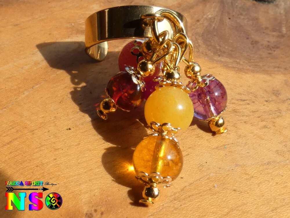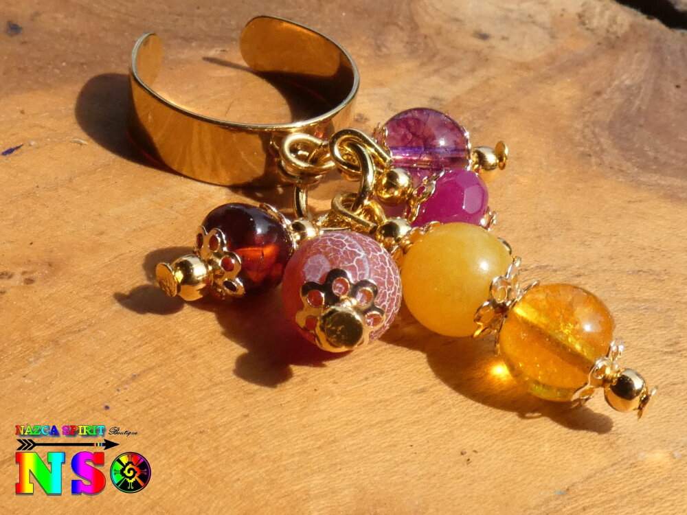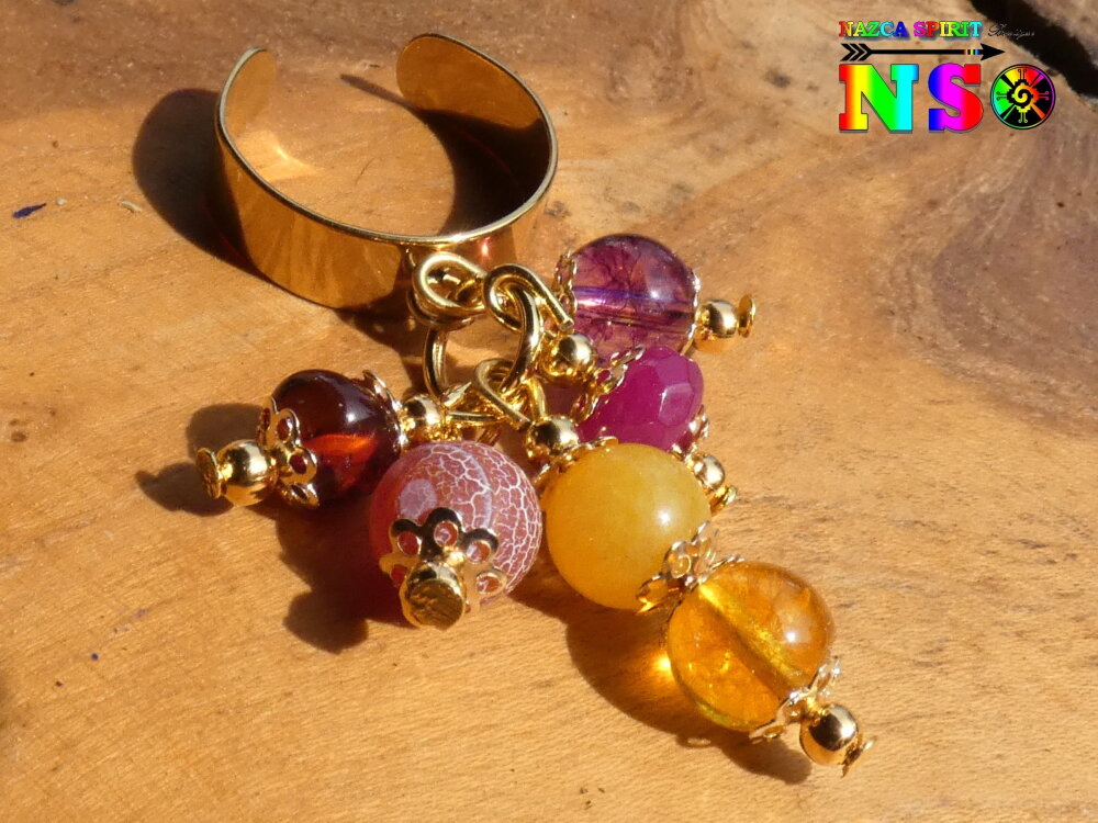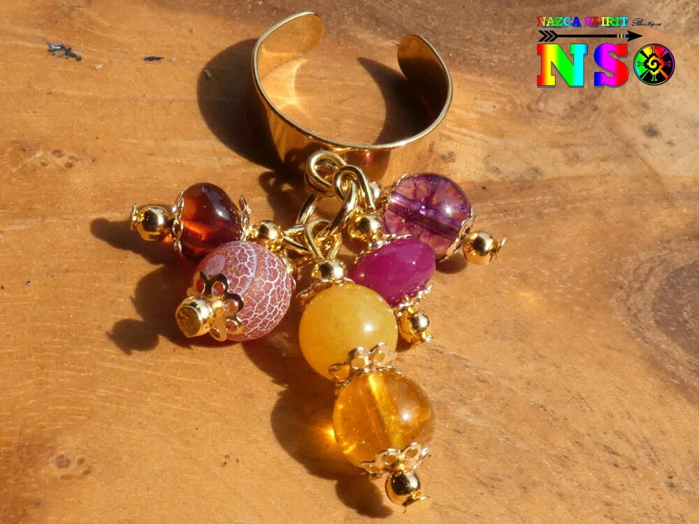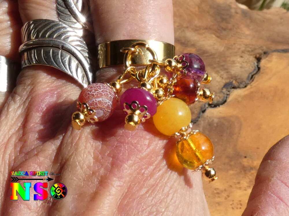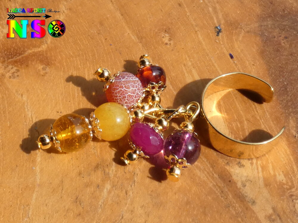 Je vous propose une superbe bague ajustable inspiration Boho Bohème réalisée à partir d'un support de bague anneau large en acier inoxydable plaqué or 18K surmonté d'un anneau sur lequel j'ai relié des pendentifs réalisés à partir de tiges en laiton, de perles fines et précieuses naturelles, de petites perles rondes en laiton or et de petites coupelles fleurs ciselées en laiton or.