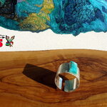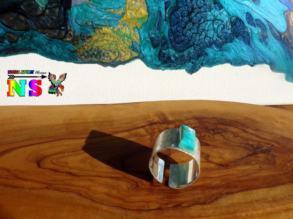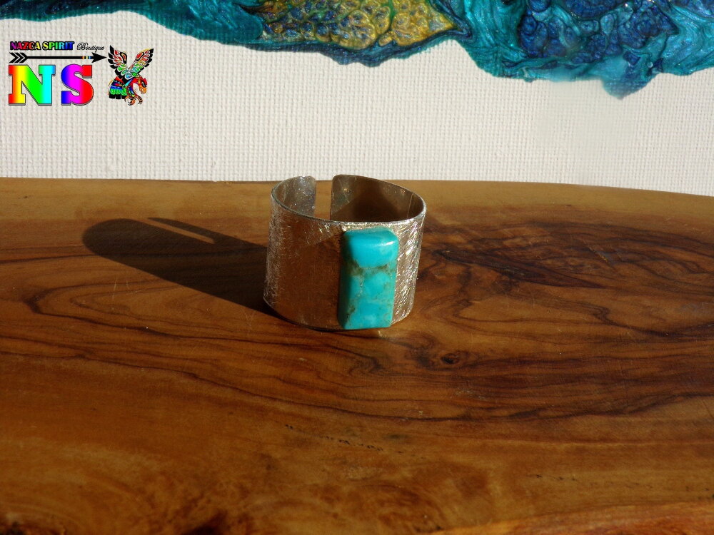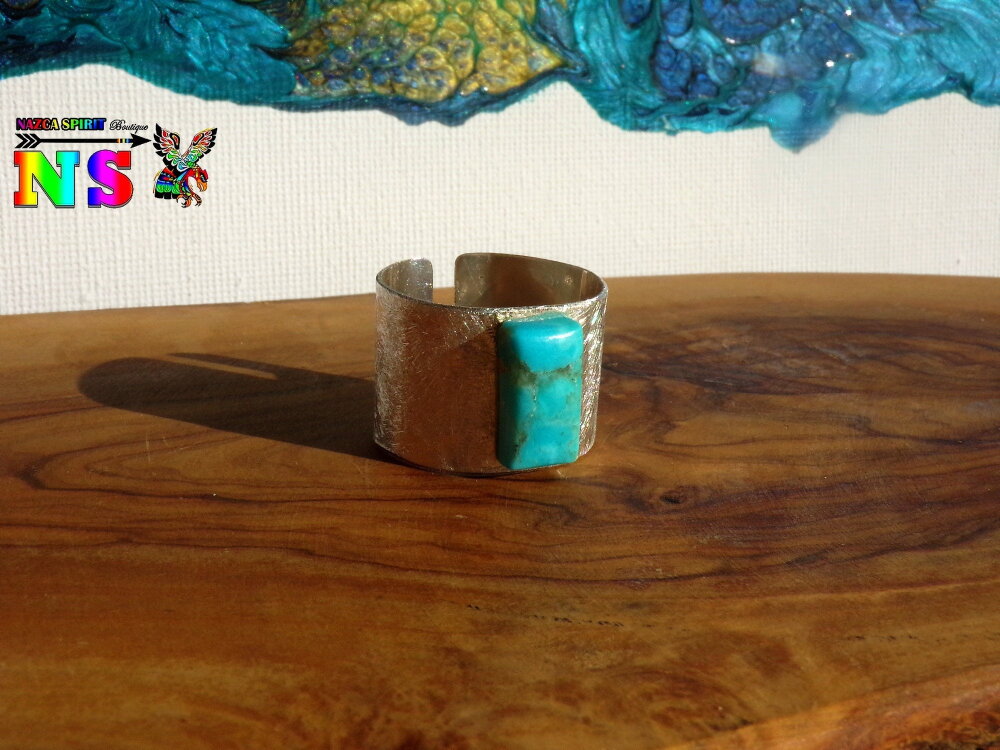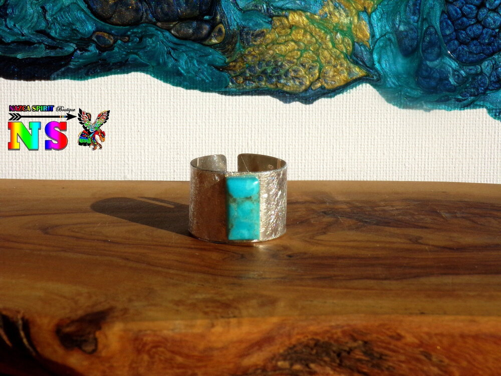 Je vous propose de découvrir une superbe bague artisanale en forme d'anneau large en argent sterling surmonté d'une turquoise naturelle sleeping beauty de forme rectangulaire.