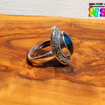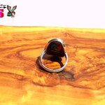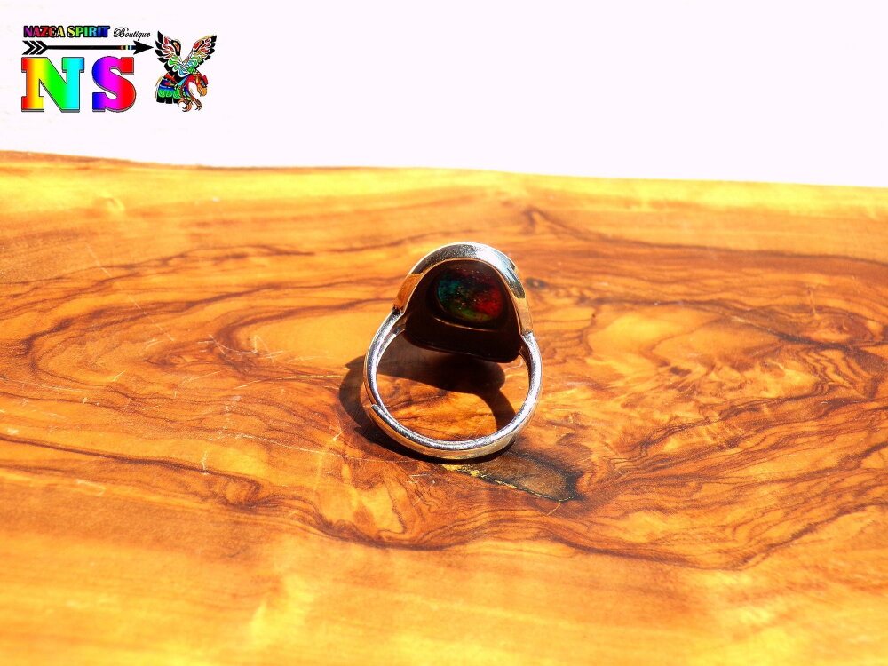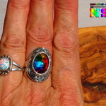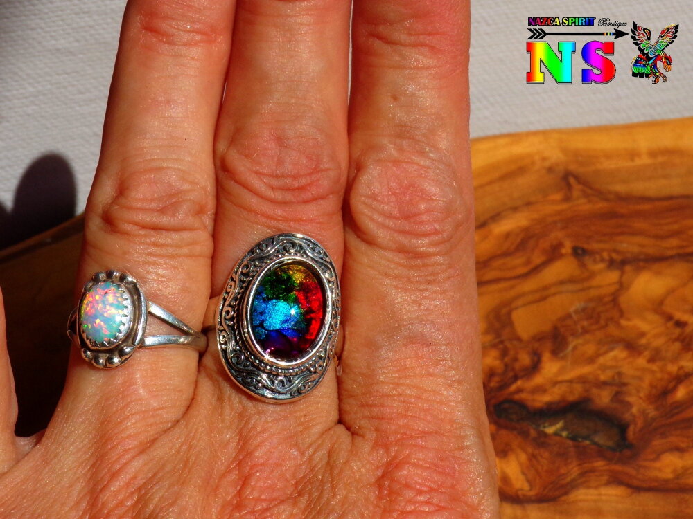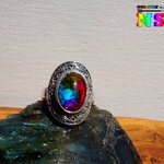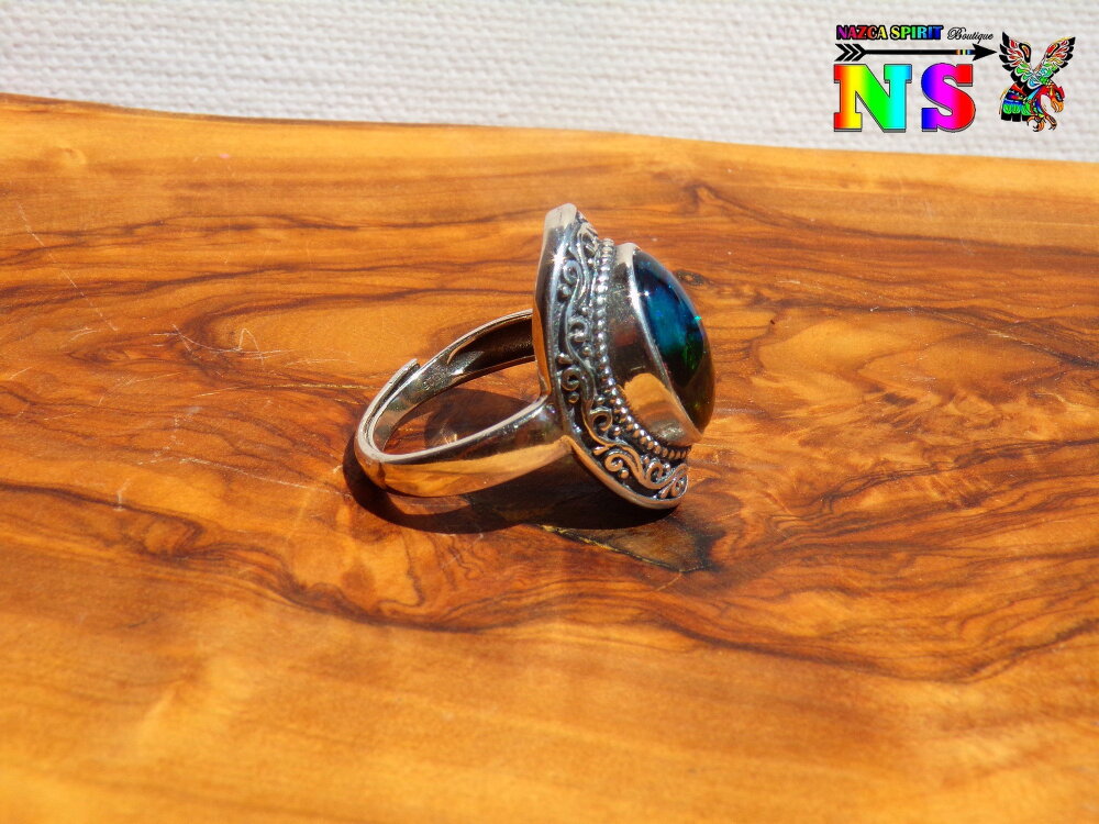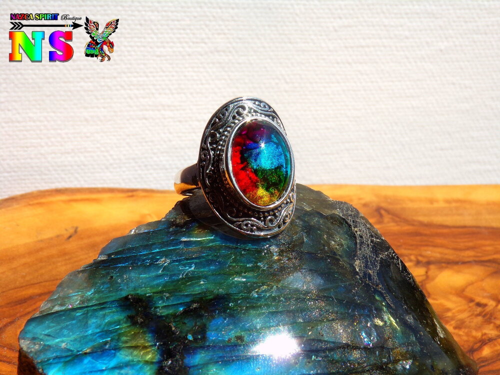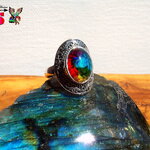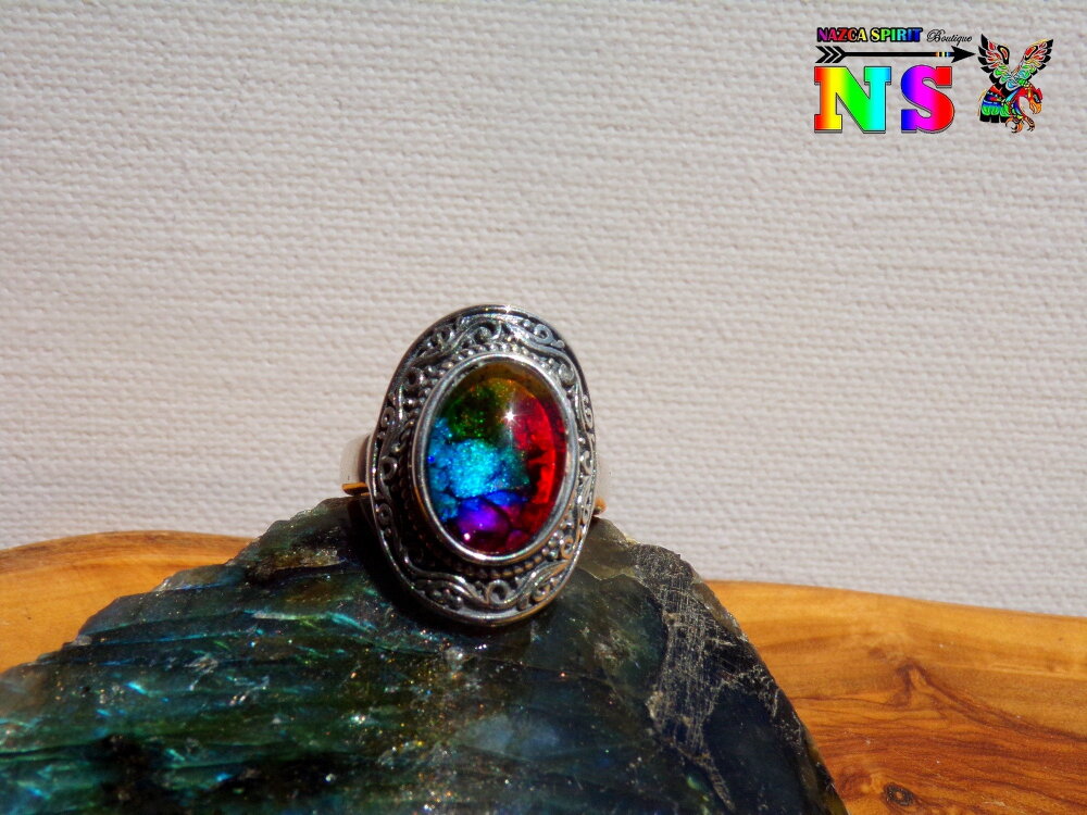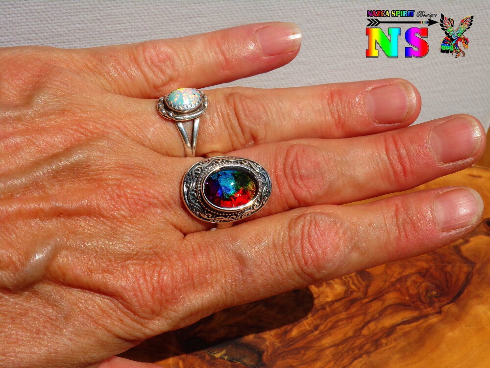 Bague ajustable en argent sterling ciselé de superbes motifs arabesques, surmontée d'un très joli cabochon ovale en verre multicolore iridescent. Le cabochon est une création artistique unique réalisée par l' Atelier Nazca Spirit (procédé de coloration breveté auprès de l'I.N.P.I).