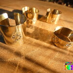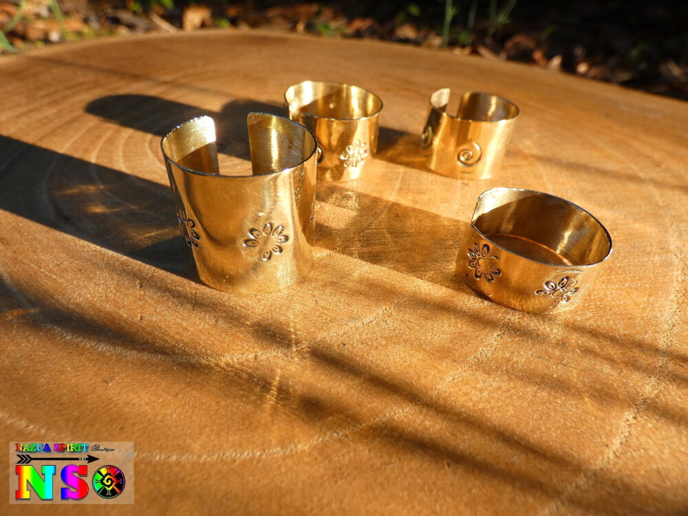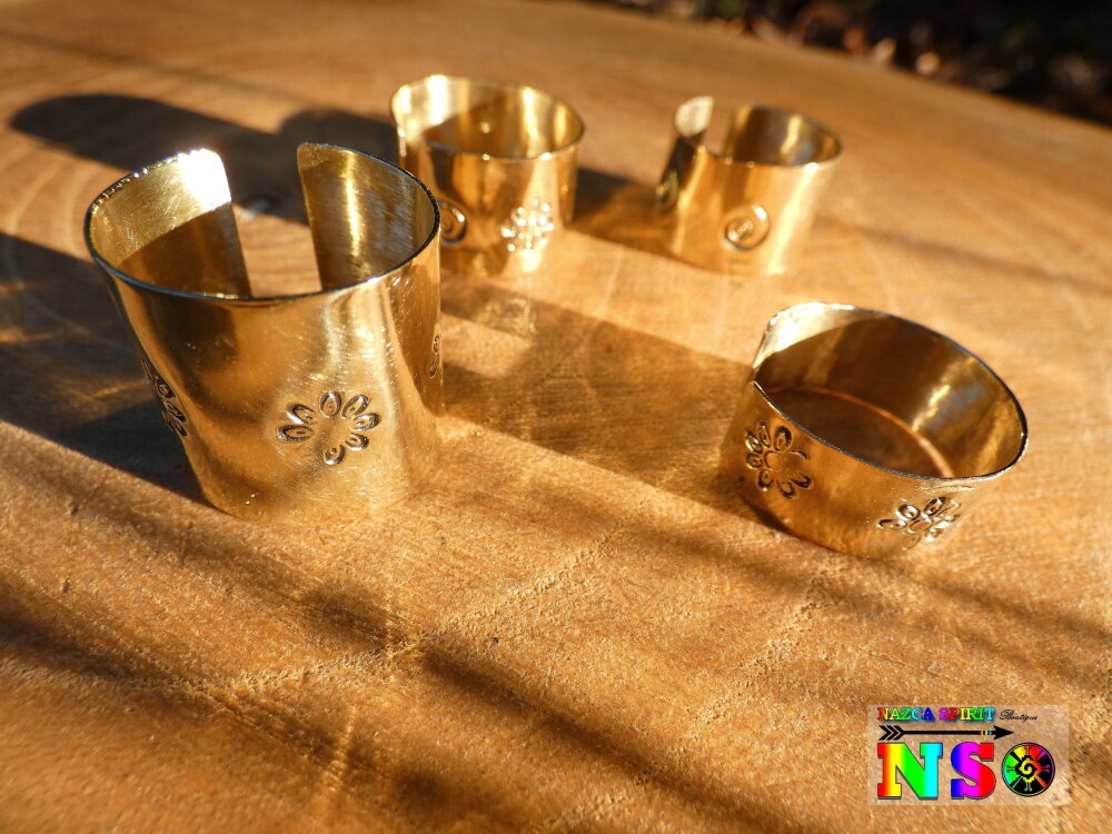 Il s'agit d'un anneau large réalisé à partir d'une plaque de laiton doré de 0.5 mm d'épaisseur. L'anneau fait 1.5 cm ("0.59) de large. J'ai agrémenté ce superbe anneau aux douces notes bohème hippie de jolis motifs spirales.