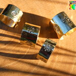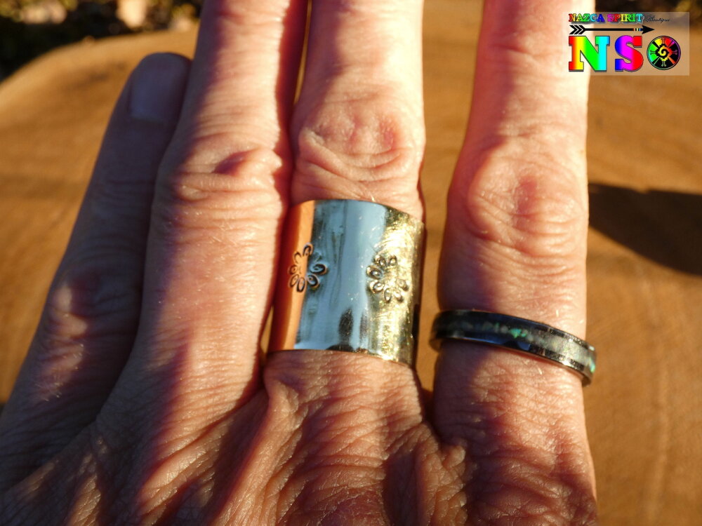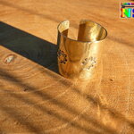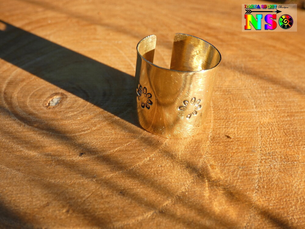 Il s'agit d'un anneau large réalisé à partir d'une plaque de laiton doré de 0.5 mm d'épaisseur. L'anneau fait 2 cm ("078) de large. J'ai agrémenté ce superbe anneau aux douces notes bohème hippie de jolis motifs floraux.