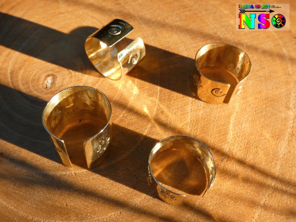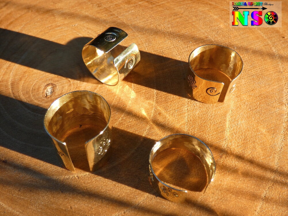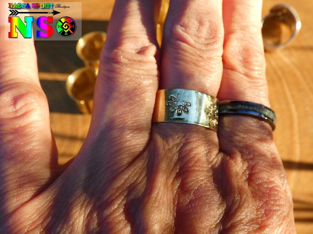 Bague Ajustable Jonc Anneau Large en Laiton Or - Bijou Fait Main avec Motifs Fleurs Effet Relief- Bague Ethnique Poinçons Artisanaux.