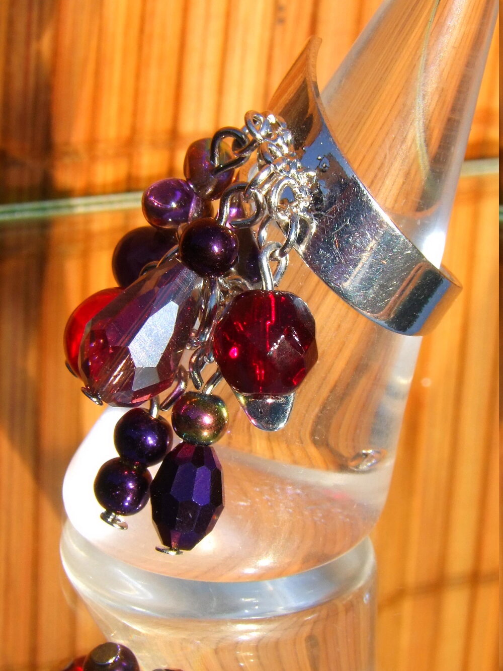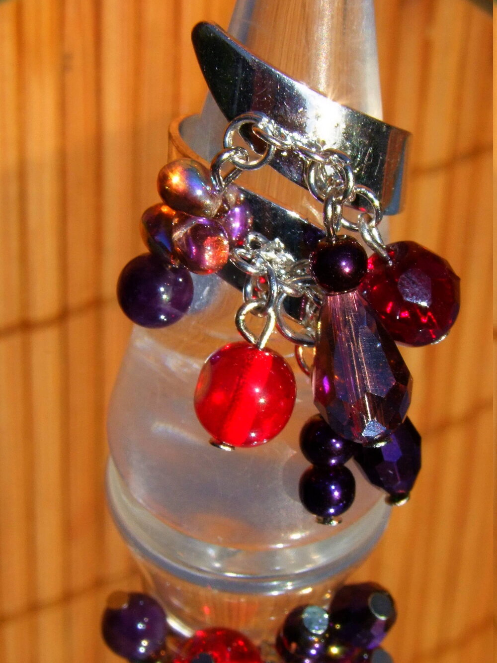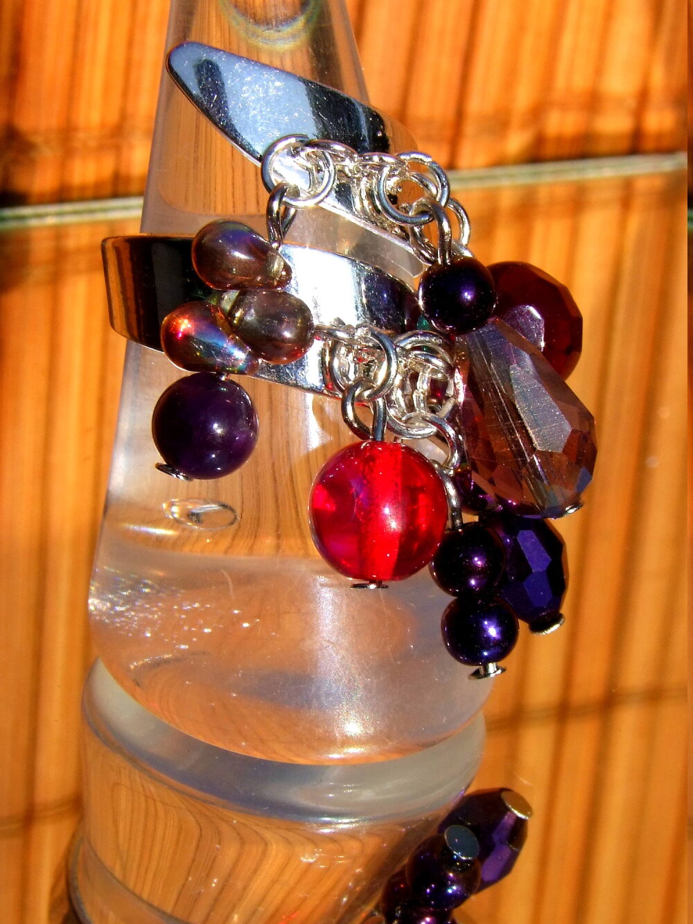 J'ai ensuite relié sur le sommet de la bague à l'aide d'anneaux épais des petites breloques réalisées à la main à partir de tiges en cuivre plaqué argent, d'une perle ronde de 6 mm en améthyste naturelle, de perles en cristal de bohème violine et mauve iridescent, d'une grande perle goutte facettée cristal Swarovski smoked Topaze AB, de perles en cristal de bohème pourpre iridecent, de petites perles Toho en cristal ambre iridescent et de petites perles de 4 mm eb cristal de bohème Iris blue.