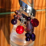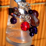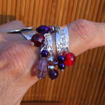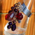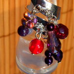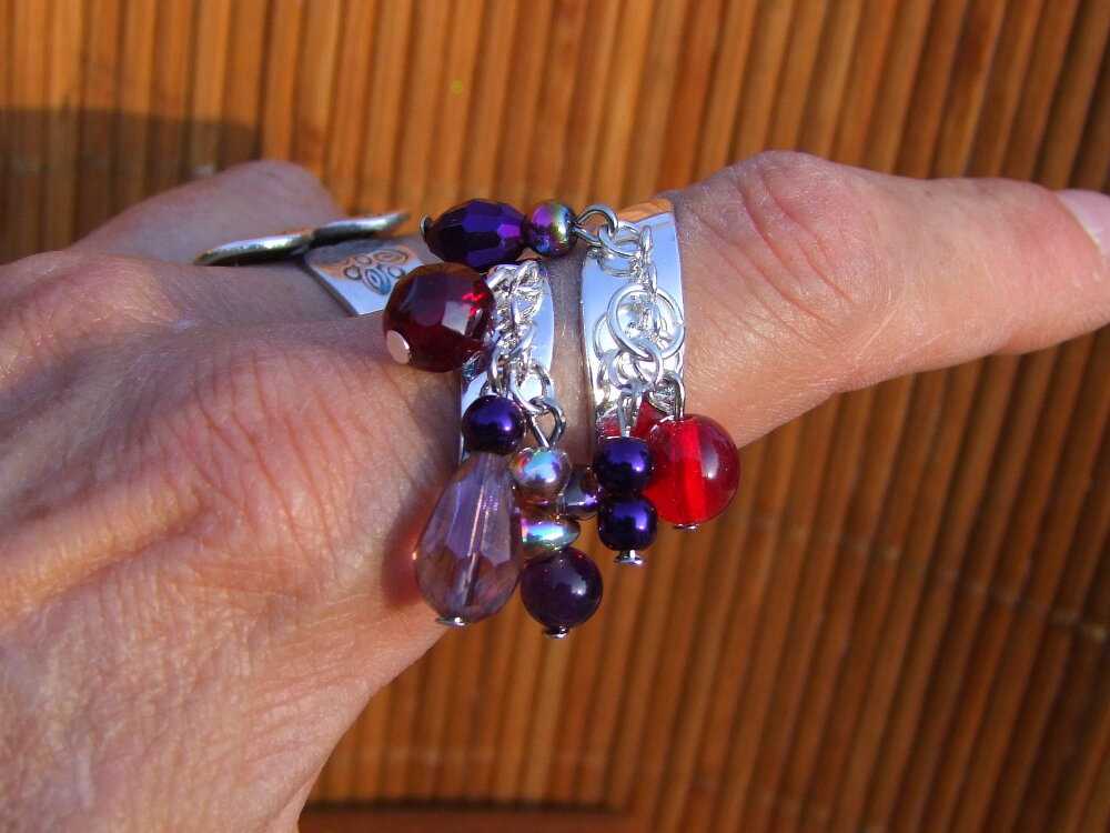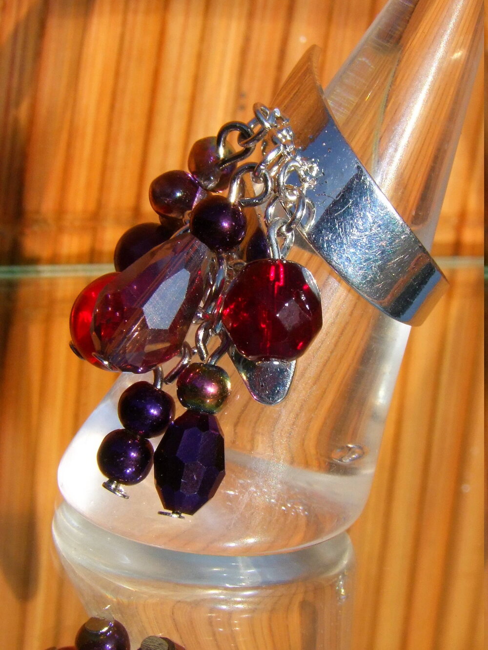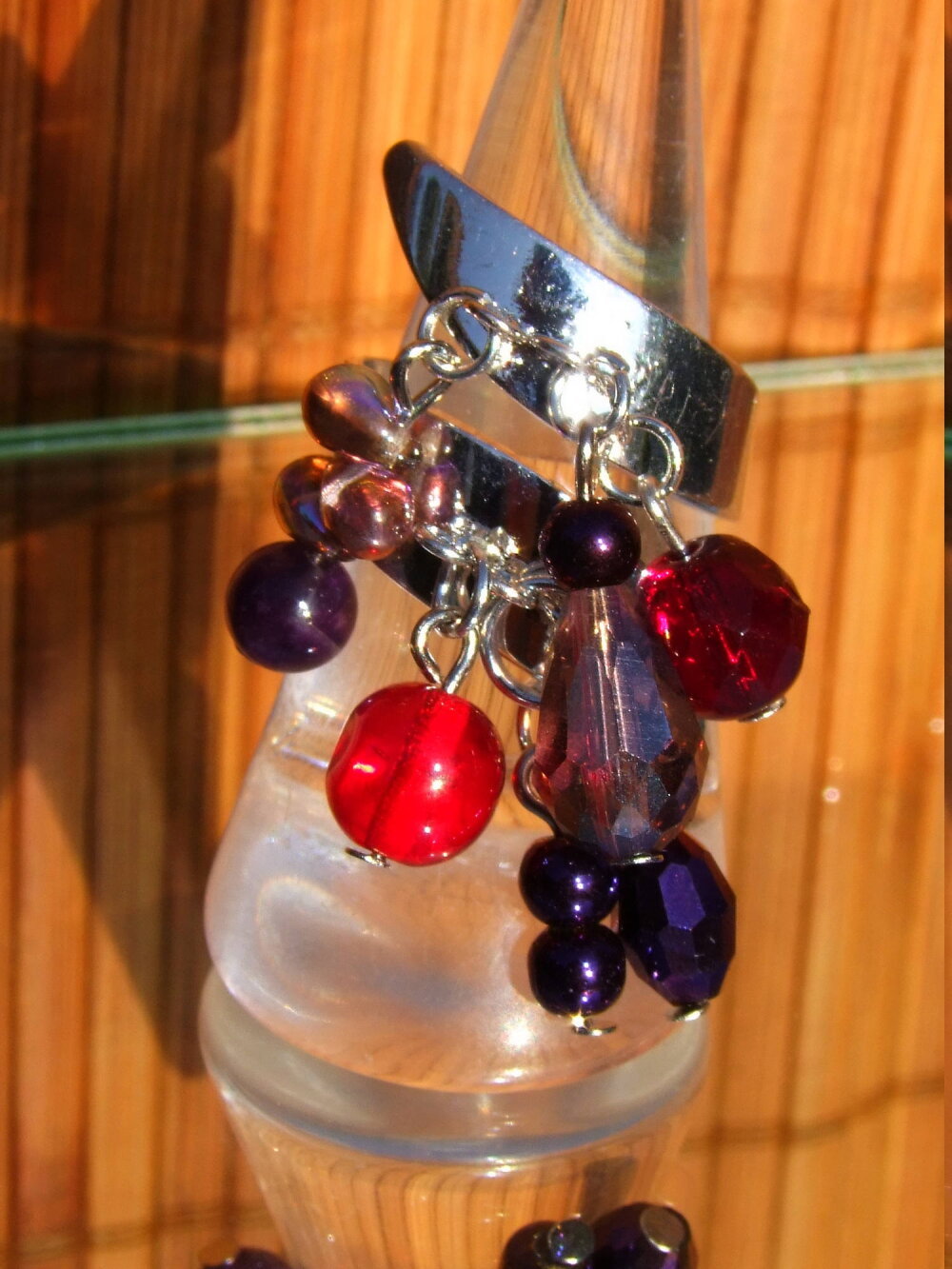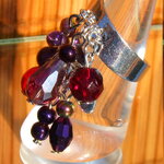 J'ai ensuite relié sur le sommet de la bague à l'aide d'anneaux épais des petites breloques réalisées à la main à partir de tiges en cuivre plaqué argent, d'une perle ronde de 6 mm en améthyste naturelle, de perles en cristal de bohème violine et mauve iridescent, d'une grande perle goutte facettée cristal Swarovski smoked Topaze AB, de perles en cristal de bohème pourpre iridecent, de petites perles Toho en cristal ambre iridescent et de petites perles de 4 mm eb cristal de bohème Iris blue.