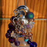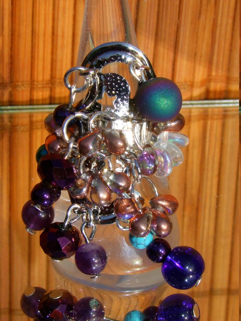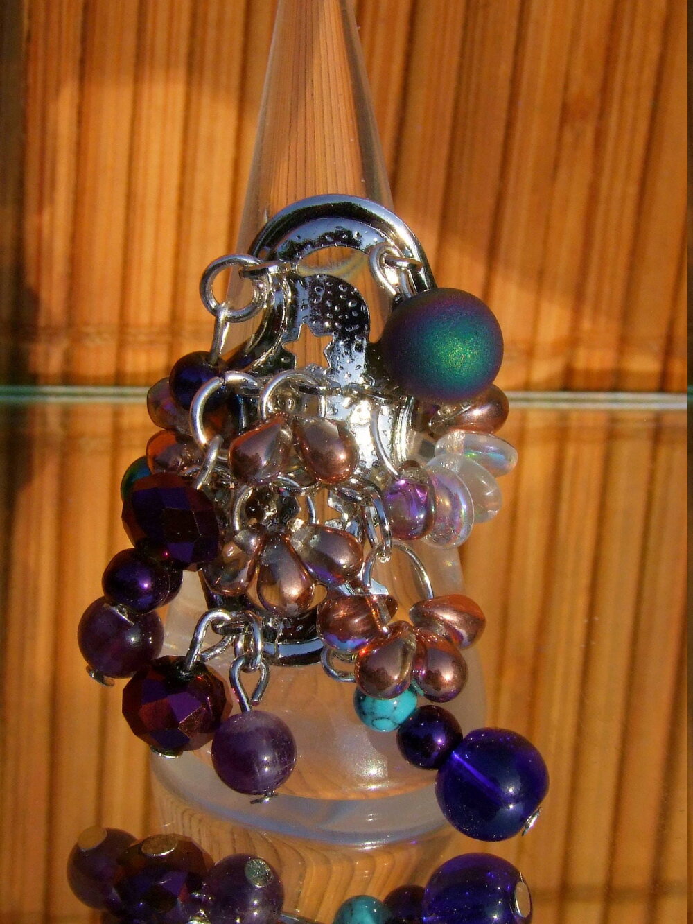 J'ai ensuite relié sur le sommet de la bague à l'aide d' anneaux épais des petites breloques réalisées à la main à partir de tiges en cuivre plaqué argent, de perles en cristal de bohème, de 2 petites perles rondes de 6 mm de diamètre en véritable améthyste, d'une perle ronde de 4 mm en turquoise naturelle et d'une grande perle de 8 mm en agate titane multicolore aux doux reflets bleutés et violine iridescents.