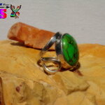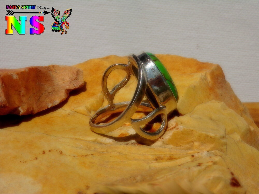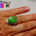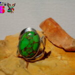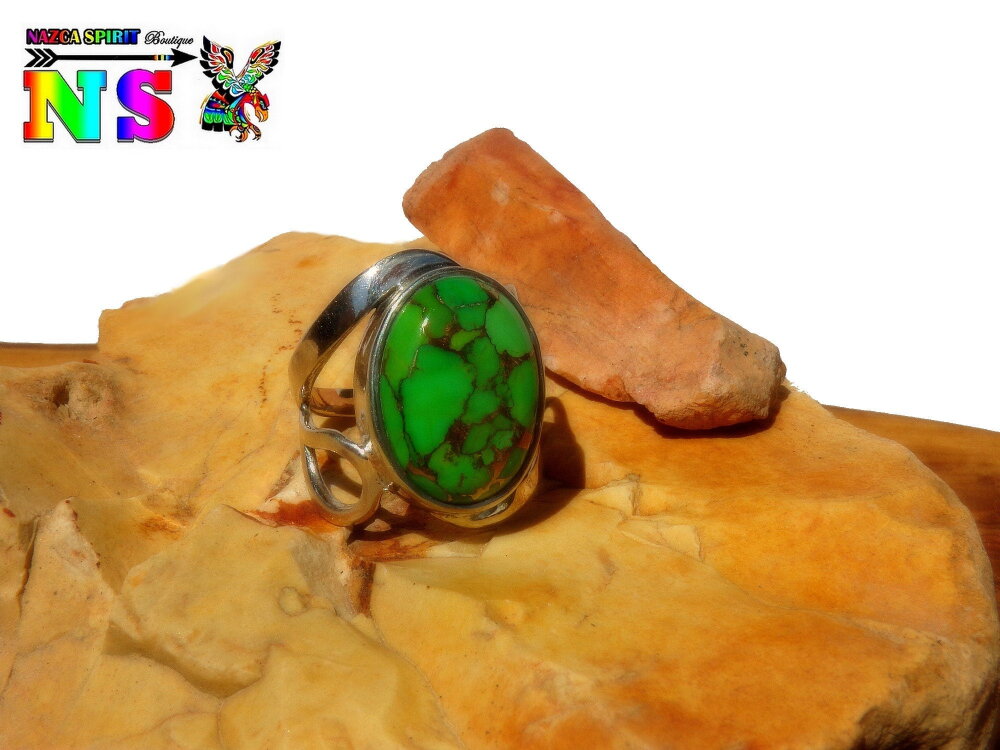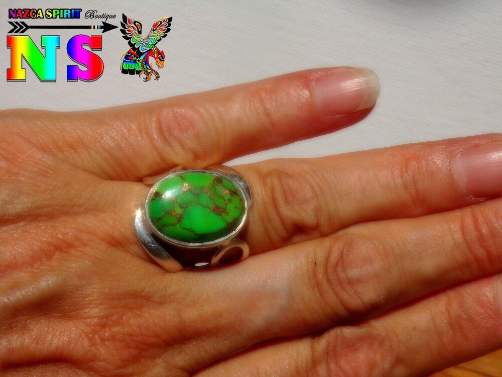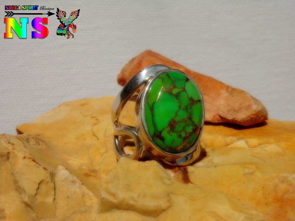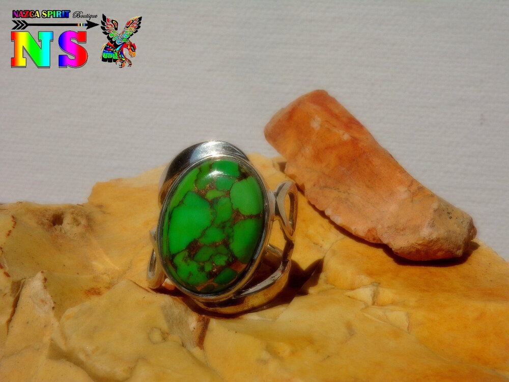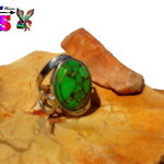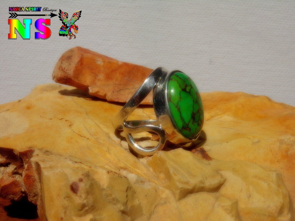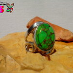 Je vous propose de découvrir une bague amérindienne en argent sterling surmontée d'une sublime turquoise mohave verte et cuivre origineTexas.
