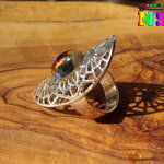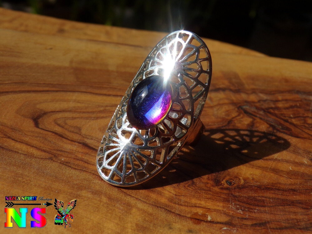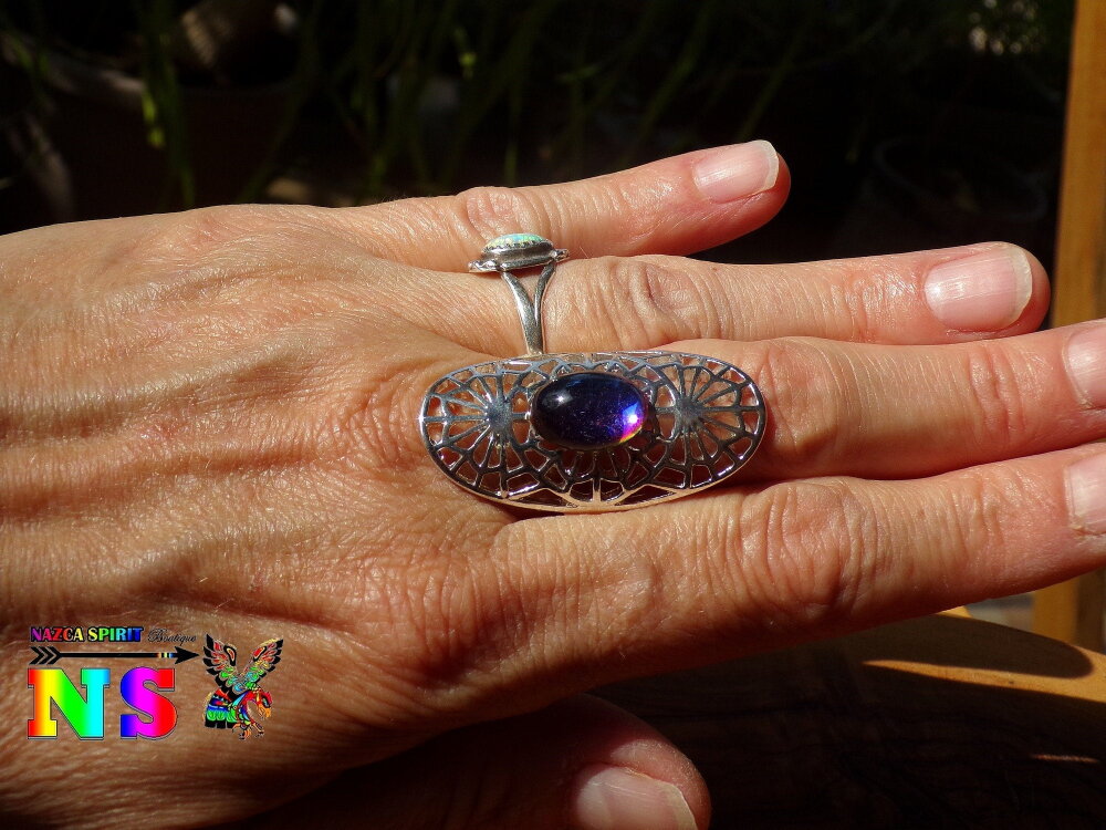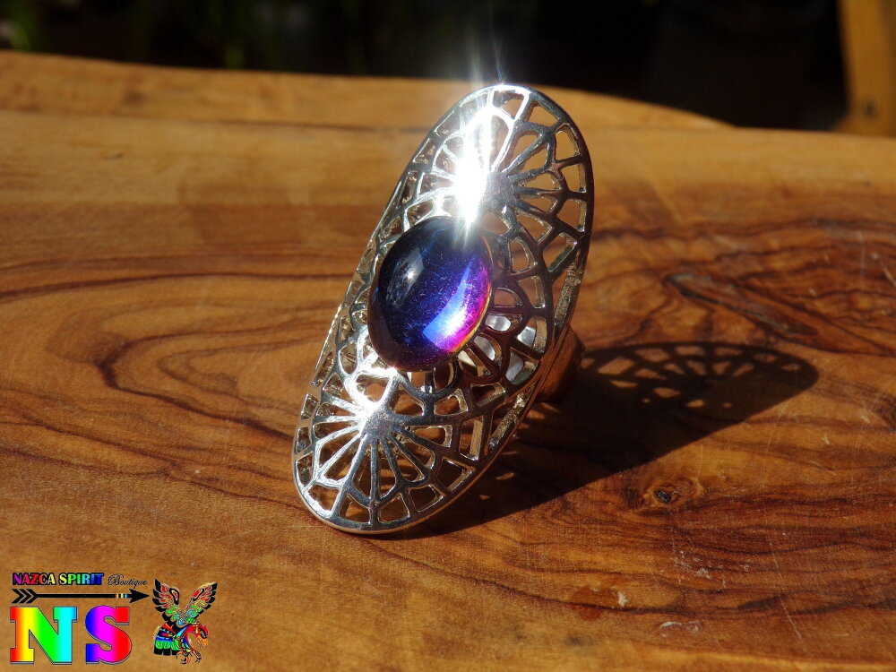 Bague bohème métal plaqué argent - Taille France T63 (US 10 1/4) - Détails floraux ciselés - Cabochon en cristal autrichien Héliotrope