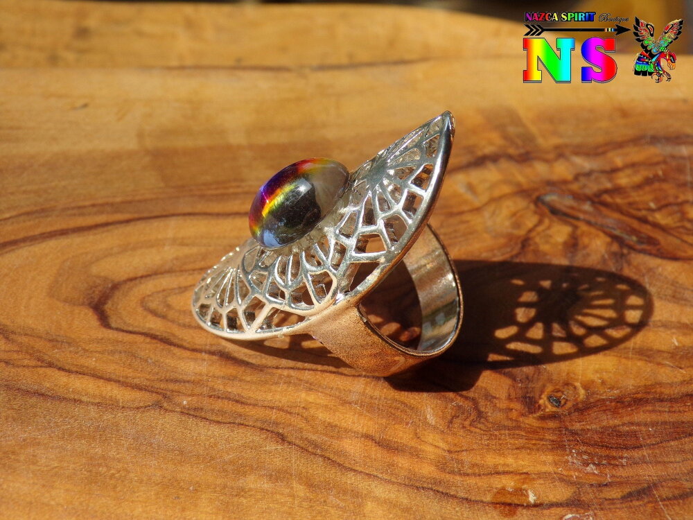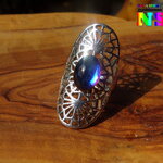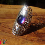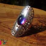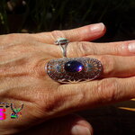 Je vous propose de découvrir une superbe bague de style bohème en métal plaqué argent ciselé de jolis motif floraux. J'ai surmonté la bague d'un superbe cabochon RARE de forme ovale en cristal Swarovski couleur héliotrope de 1.3 cm x 1.1 cm ("0.51 x "0.43)