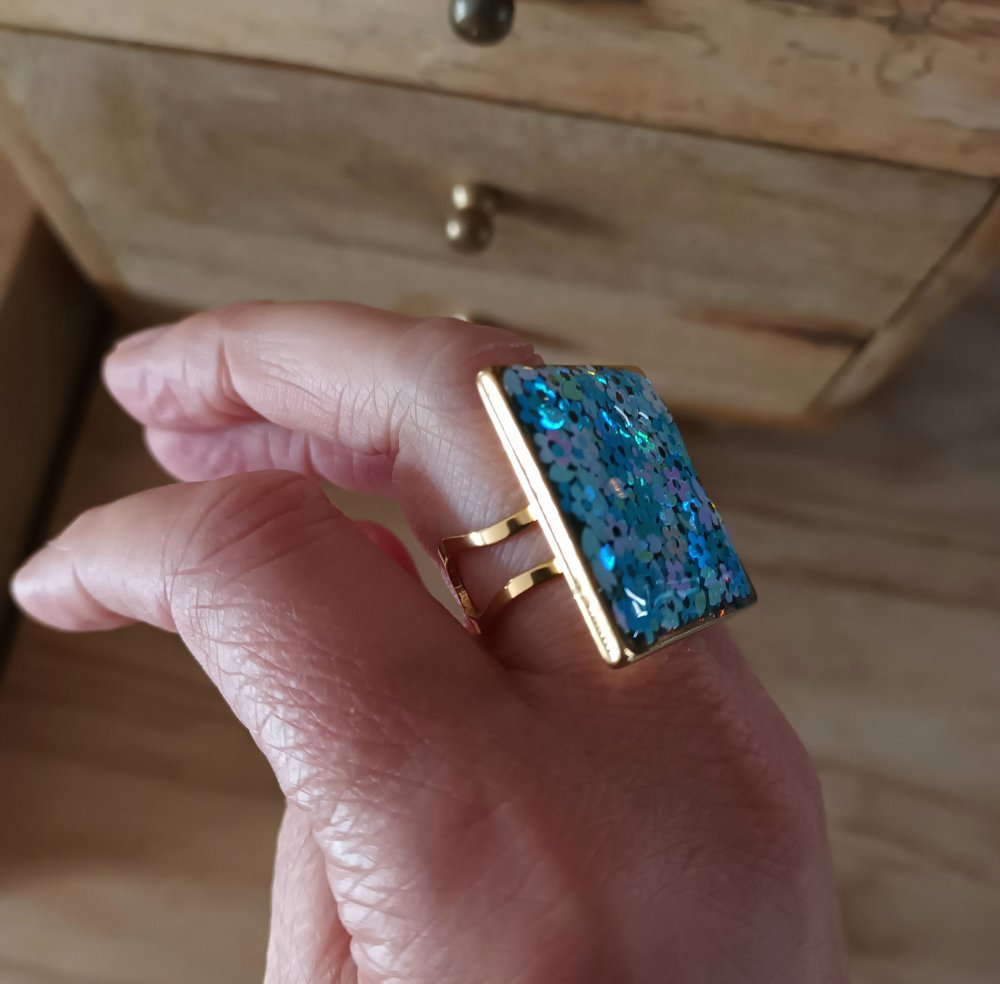 Bague ajustable en résine et déco fleurs incrustée