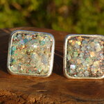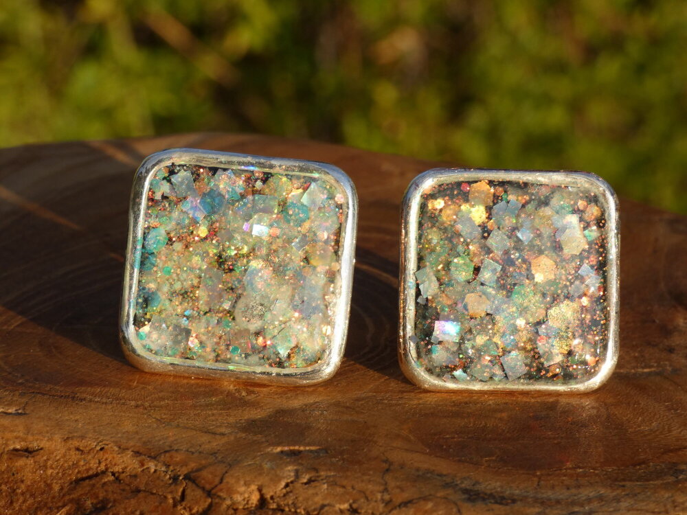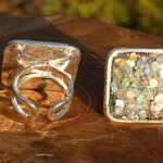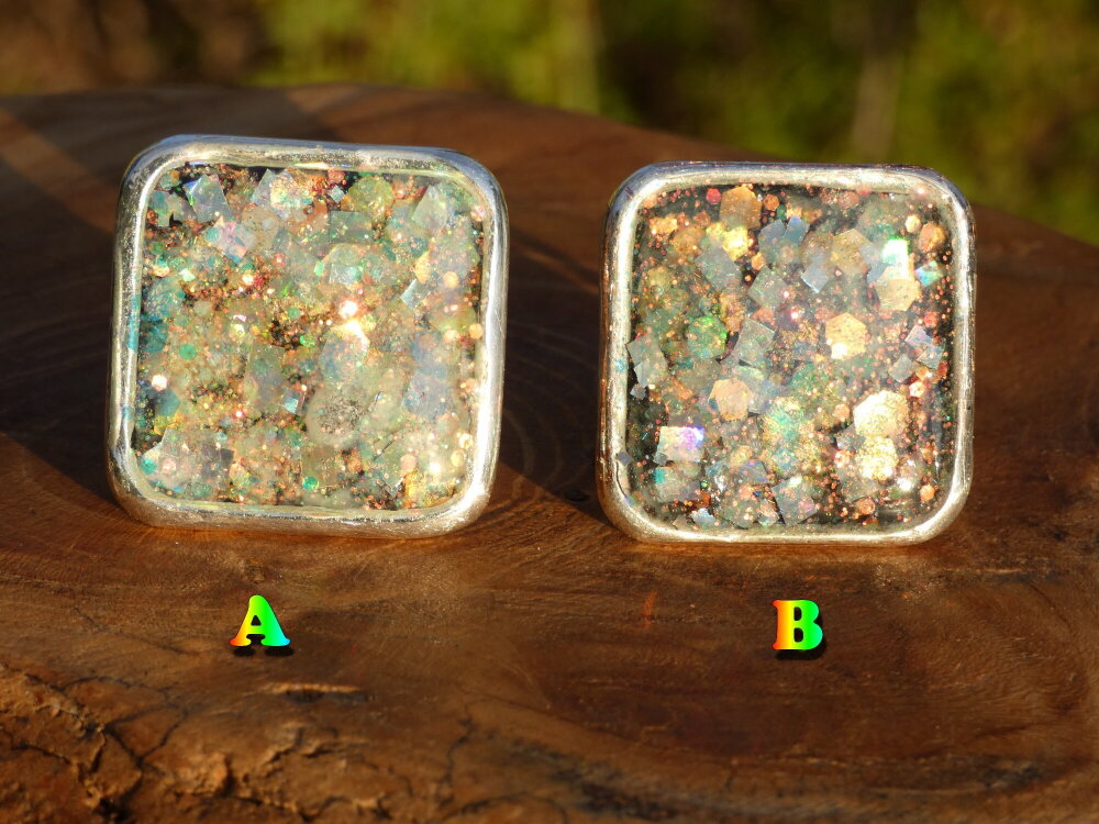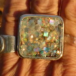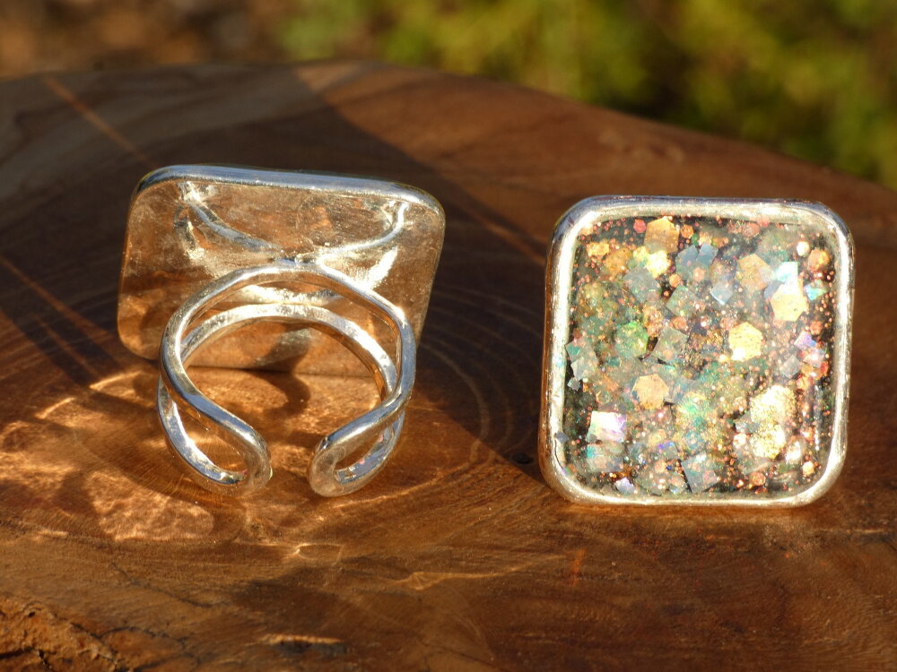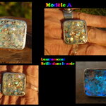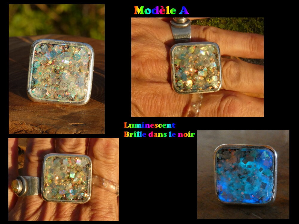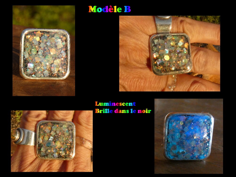 J'ai réalisé ces bagues cocktail à la fois Ultra originales et Ultra lumineuses à partir d'un supports de bagues réglables en cuivre plaqué argent équipées d'un plateau carré de 2.5 cm x 2.5 cm, de poudres luminescentes, de paillettes opalescentes et laser et de résine cristal provenant de mon fidèle fournisseur basé sur Paris. Ces superbes bagues sont dotées d'un anneau aux courbes Design Ultra Tendance (voir photos montrant l'arrière des bagues)