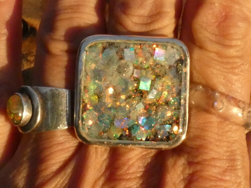 Grâce aux paillettes effet opale (multi-feux) et aux poudres luminescentes (la bague brille dans le noir), les couleurs de la bague changent en fonction de son orientation sous les rayons solaires ou sous les lumières artificielles rendant le bijou presque "vivant".