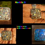Matériau : support cuivre plaqué argent (origine : UK), poudres luminescentes, paillettes opalescentes et laser, résine cristal (Origine : Allemagne)