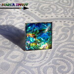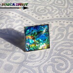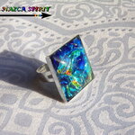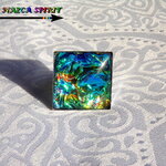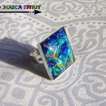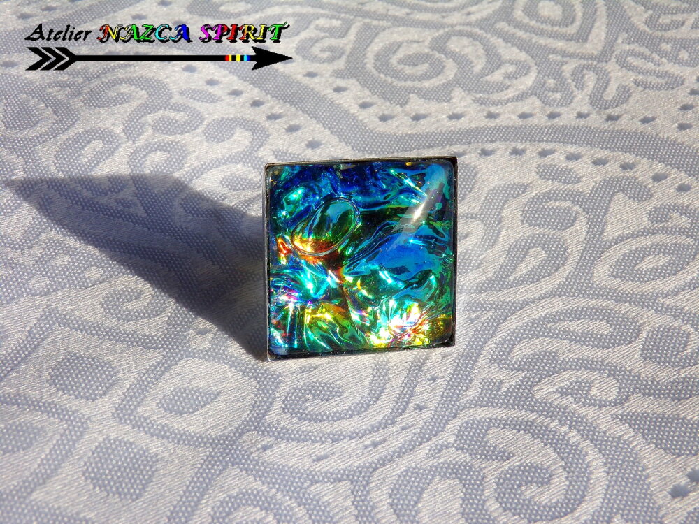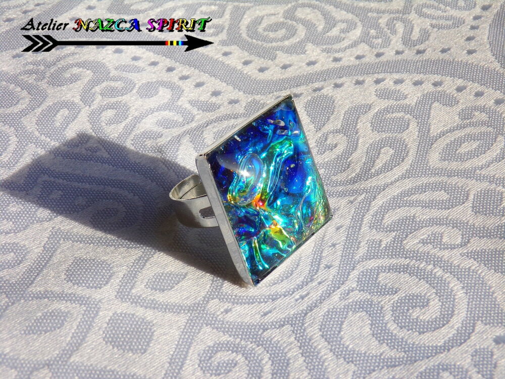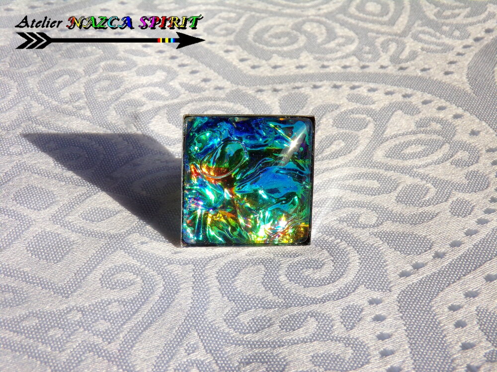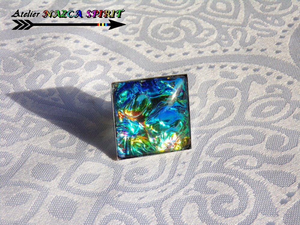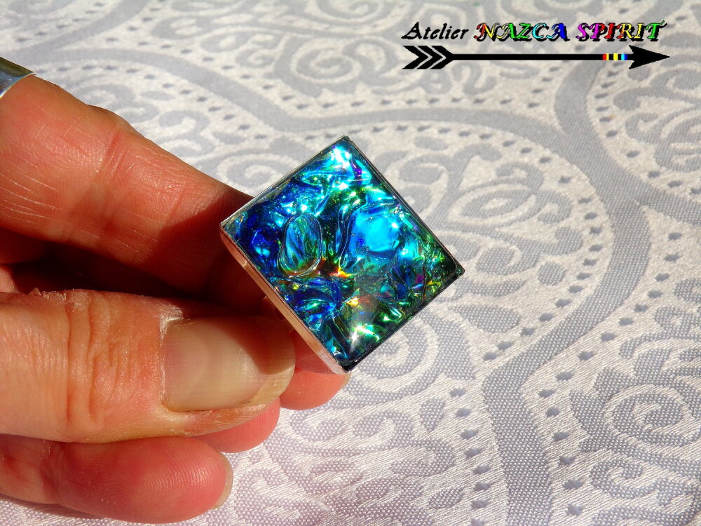 J'ai réalisé cette bague Ultra originale à partir d'un support de bague en cuivre plaqué argent et d'un cabochons en verre Carré Effet Loupe de 2.5 cm que j'ai travaillé à l'aide d'une technique de coloration unique inventée et développée sur 4 ans (Procédé Technique déposé et enregistré auprès de le l'INPI sous le Numéro National DSO2017003817 en 2013).