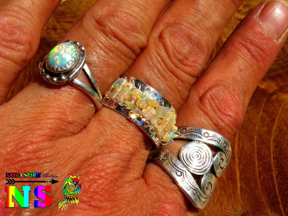 La bague a été tissé à l'aide de fil en argent 925 et de 35 perles d'opales de 1 mm ("0.039) à 2 mm ("0.07) de diamètre.