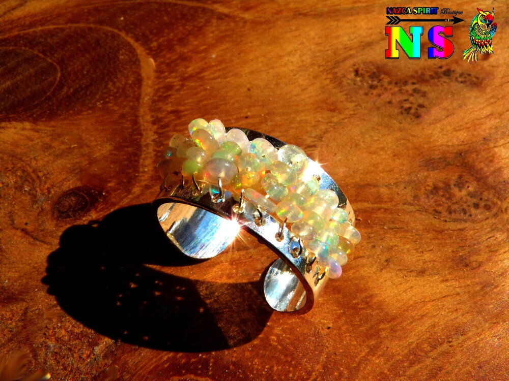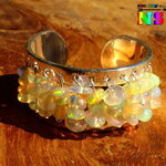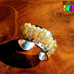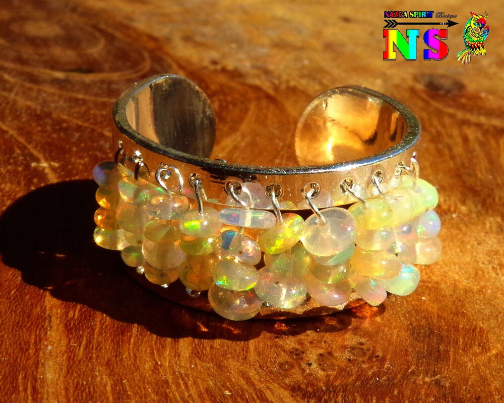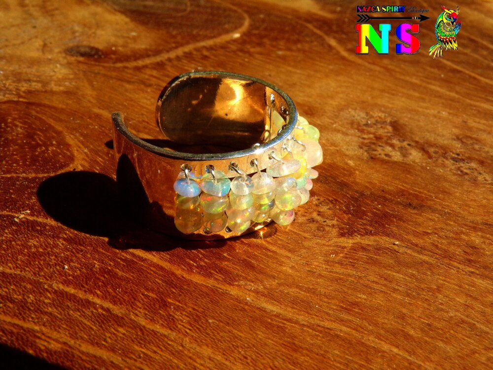 Je vous propose de découvrir une superbe bague esclave jonc artisanale ajustable d'inspiration bohème ethnique en cuivre plaqué argent et en perles d'opales Ethiopiennes tissées.