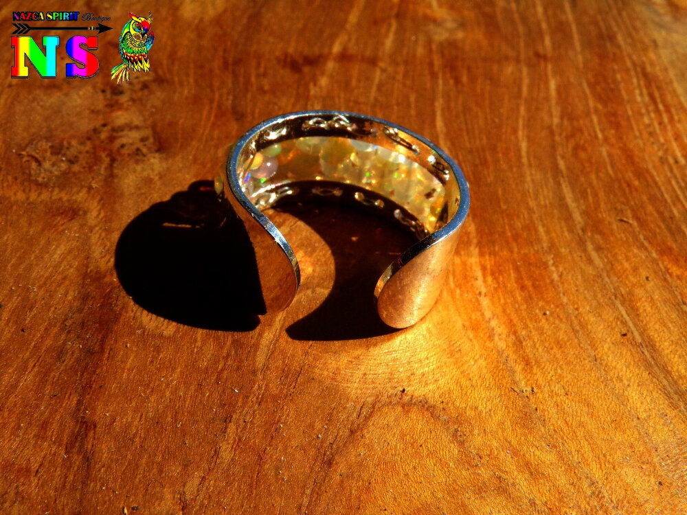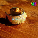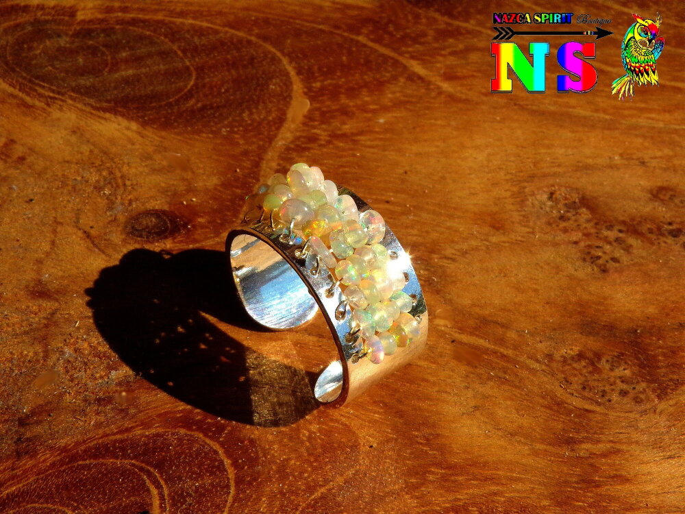 Pour réaliser cette création unique, j'ai utilisé un support de bague en cuivre plaqué argent pré troué sur lequel j'ai tissé des perles roues en véritables opales d'Ethiopie.