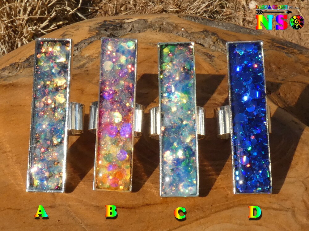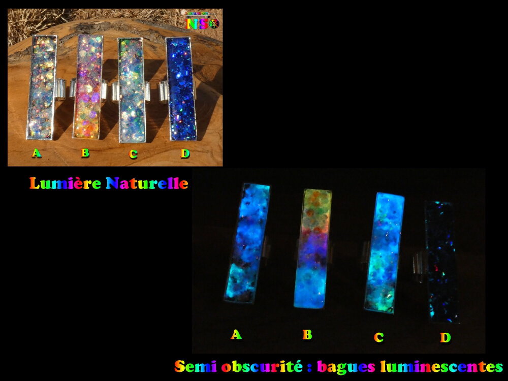 Bague Fantaisie Ajustable Multicolore Iridescent Luminescent, Bijou Rectangle Plaqué Argent Fait Main, Brille dans le Noir, Modèle au choix