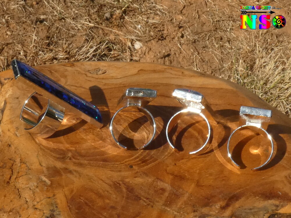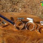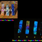 Ce procédé technique m'a permis de créer des effets lumineux Ultra iridescents quasi hypnotiques avec de superbes effets luminescents lorsque les bagues sont plongées dans l'obscurité. La bague la moins luminescente est le modèle D couleurs bleu lapis.