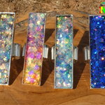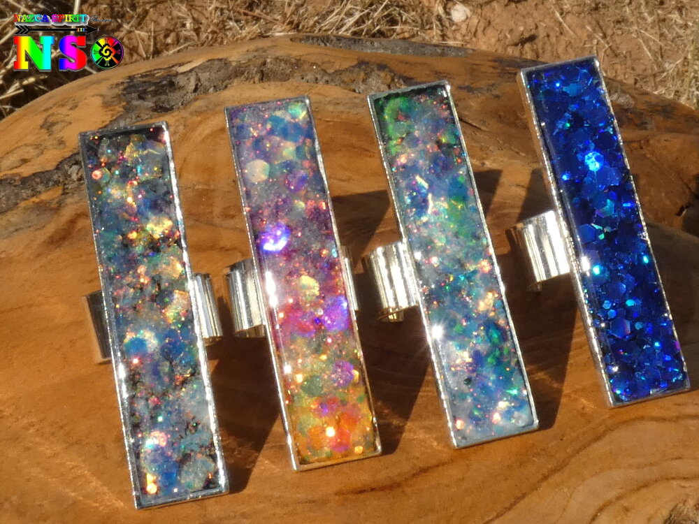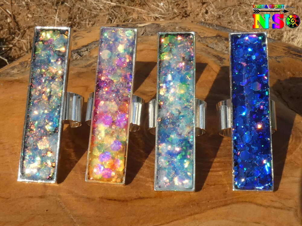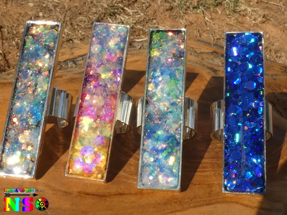 J'ai réalisé cette bague cocktail à la fois Ultra originale et Ultra lumineuse à partir d'un support de bague réglable en cuivre plaqué argent équipé d'un plateau rectangulaire mesurant 5 cm x 1 cm, de poudres luminescentes, de paillettes opalescentes et laser et de résine cristal provenant de mon fidèle fournisseur basé sur Paris.