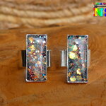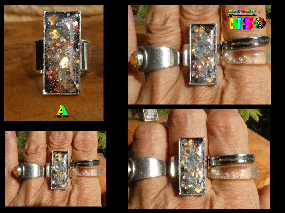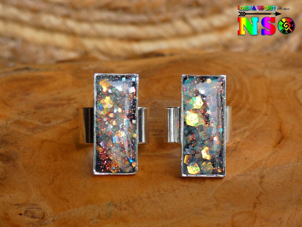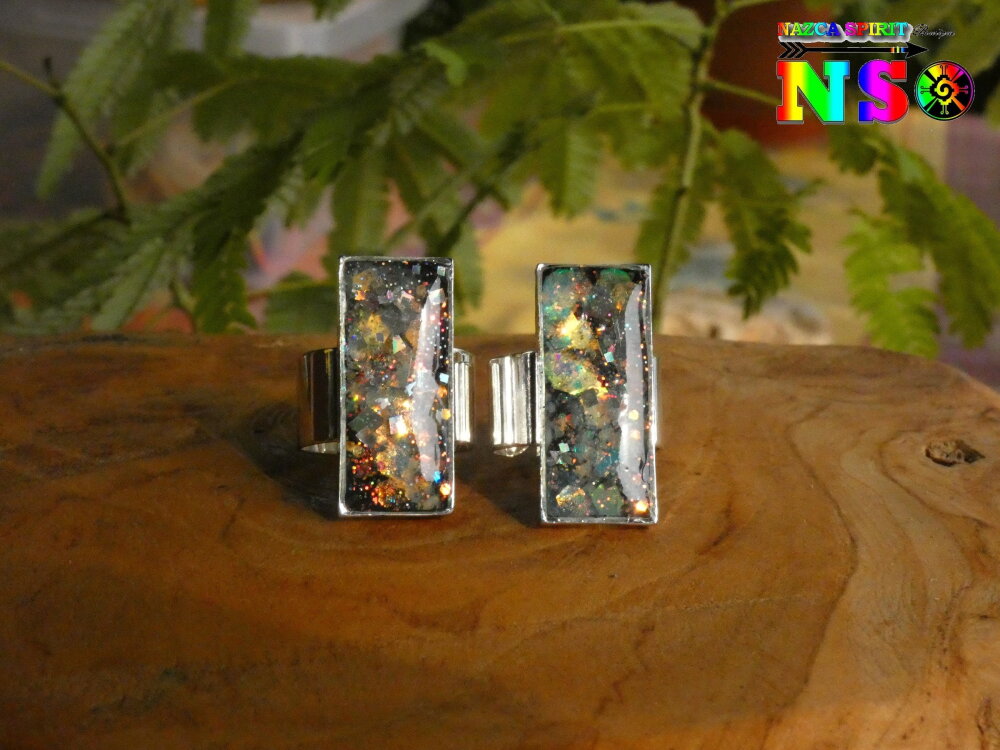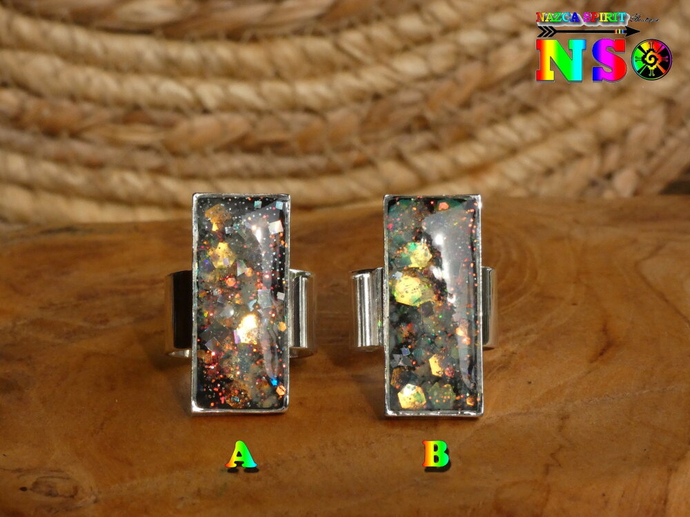 Bague Fantaisie Ajustable Multicolore Iridescent Luminescent, Bijou Rectangle Plaqué Argent Fait Main, Brille dans le Noir, Modèle au choix