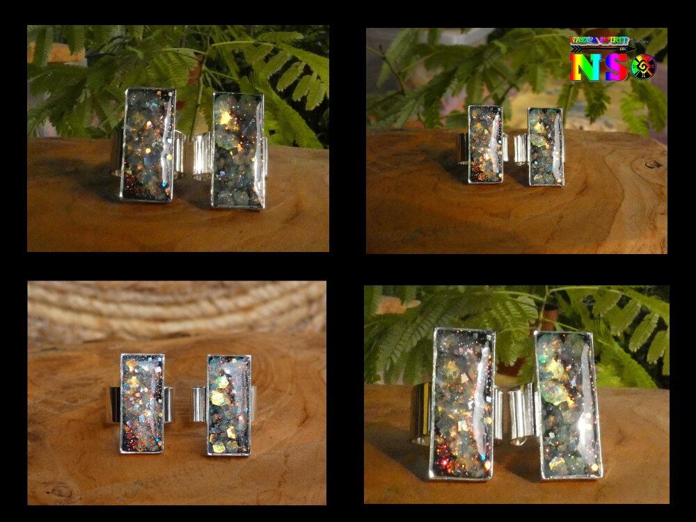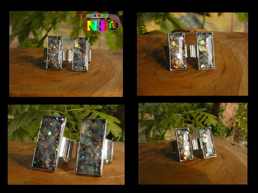 J'ai réalisé cette bague cocktail à la fois Ultra originale et Ultra lumineuse à partir d'un support de bague réglable en cuivre plaqué argent équipé d'un plateau rectangulaire mesurant 2.5 cm x 1 cm, de poudres luminescentes, de paillettes opalescentes et laser et de résine cristal provenant de mon fidèle fournisseur basé sur Paris.