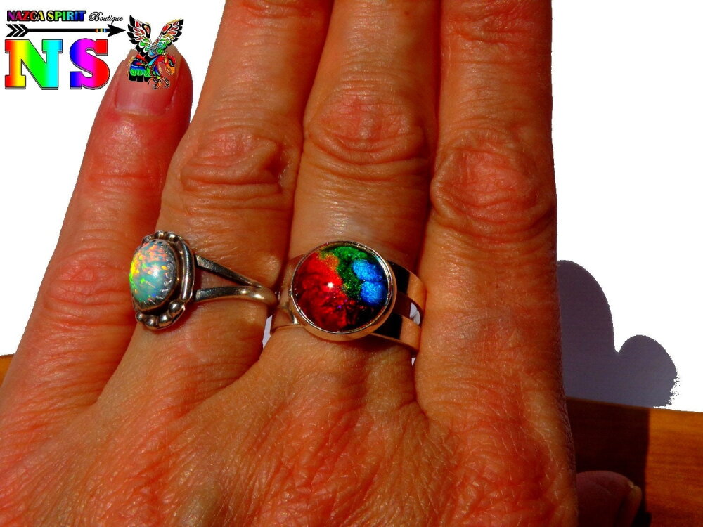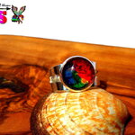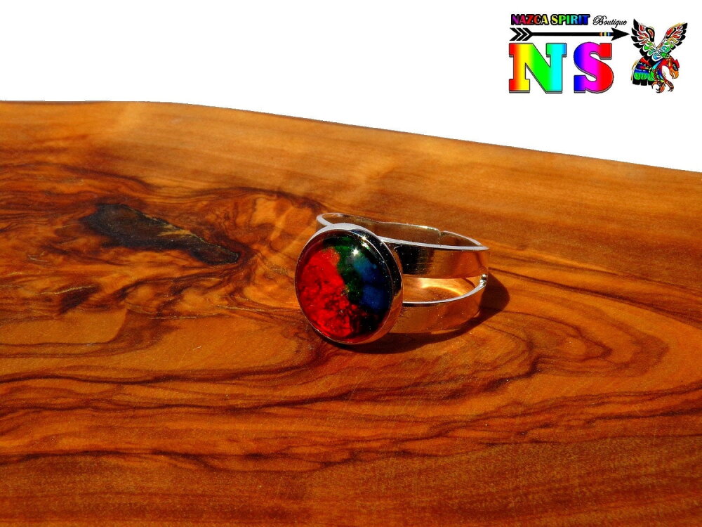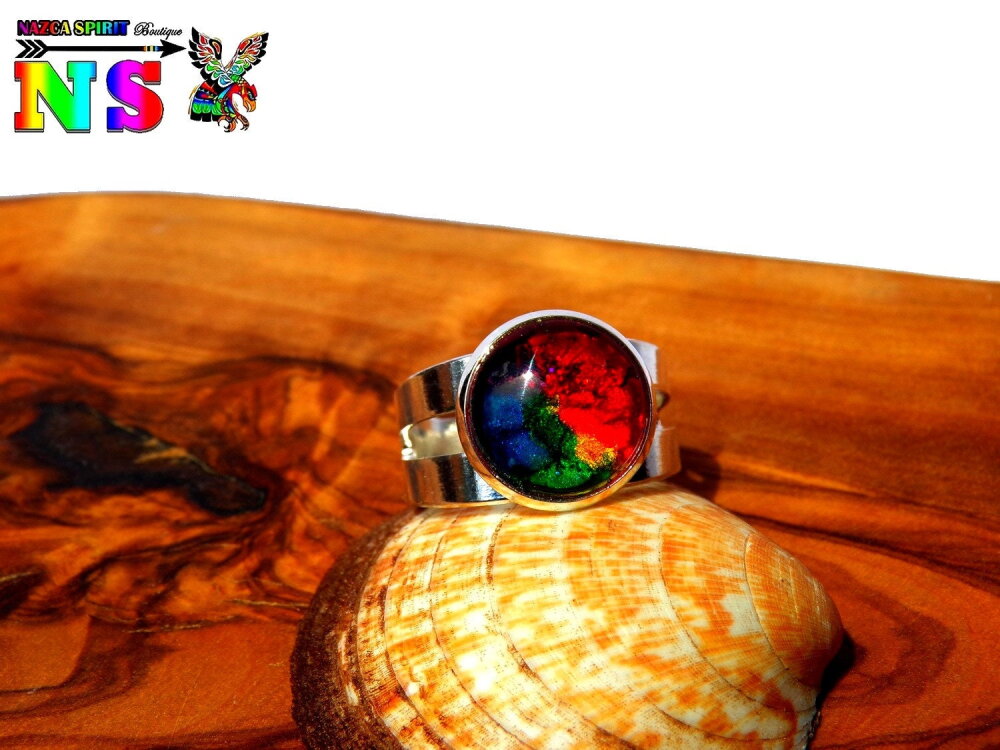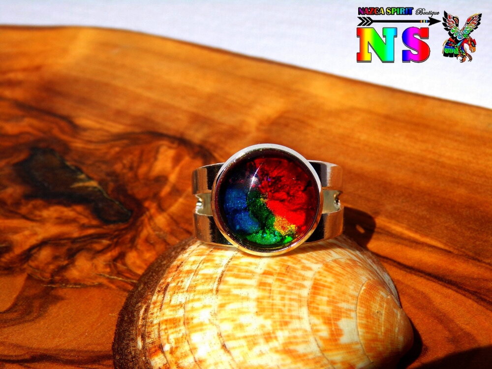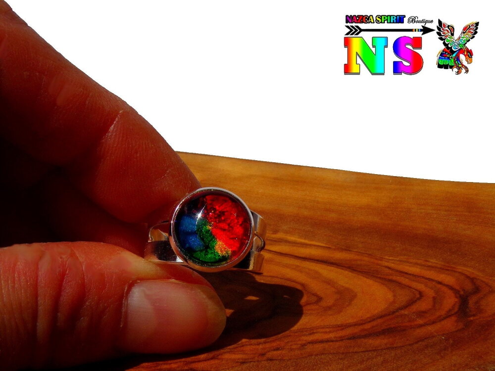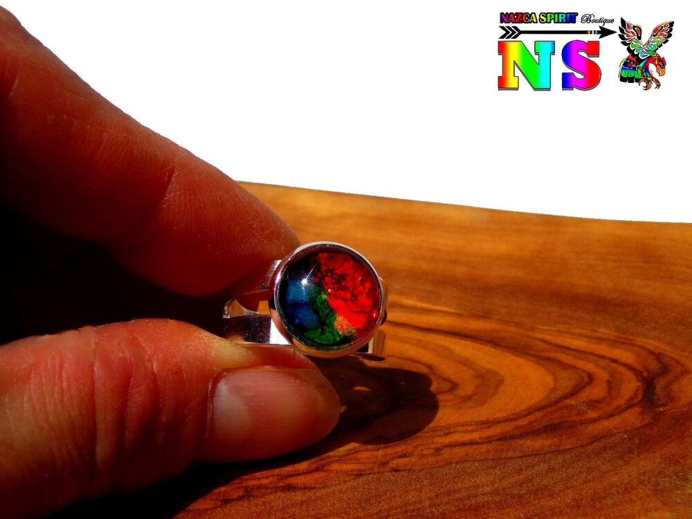 Chaque cabochon que je réalise est coloré de façon artisanale ce qui signifie que chaque cabochon est UNIQUE et que cette superbe bague au couleurs intenses et vibrantes n'existe qu'en un seul exemplaire. Il m'est impossible de recréer la même bague à l'identique sur demande. Chaque bague sera bien évidemment différente.