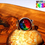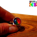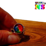 Bague Réglable Bohème Design Terre, Bijou Artisanal Fait Main, Bague Ronde Plaqué Argent, Cabochon Rond Verre Multicolore Iridescent