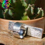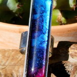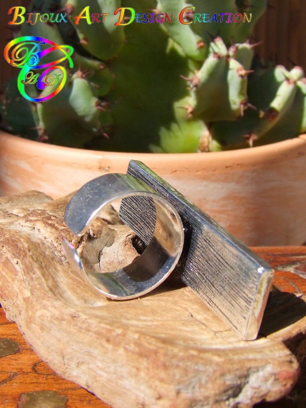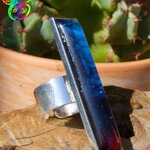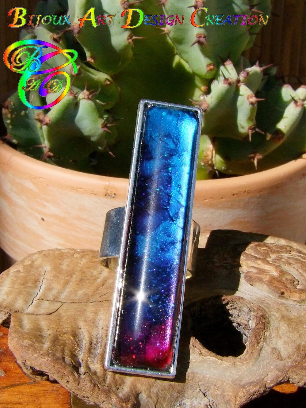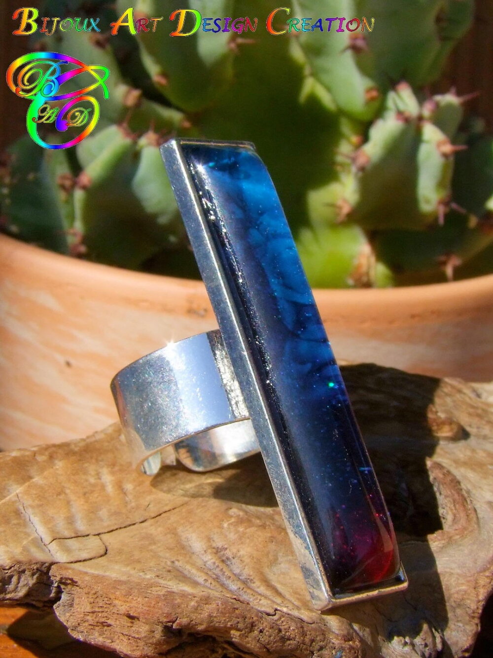 La bague est surmontée d'un très joli cabochon rectangulaire de 5 cm x 1 cm que j'ai coloré à l'aide d'une technique que j'ai inventée et mise au point en 2013 (Technique brevetée et protégée par la propriété intellectuelle).