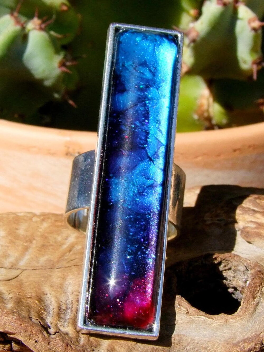 Laissez-vous transporter par ces couleurs puissantes et envoûtantes de bleu nuit, bordeaux, rouge, orange, fuchsia...lumineuses et vibrantes. Un véritable petit bout du cosmos sur l'un de vos doigts.