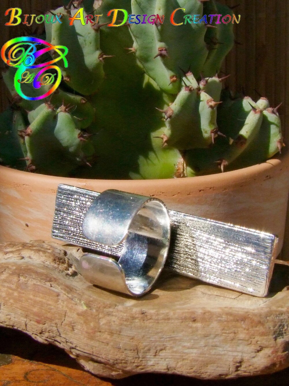 Le support de bague est un anneau large réglable en laiton plaqué argent.