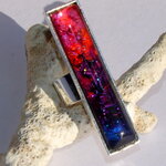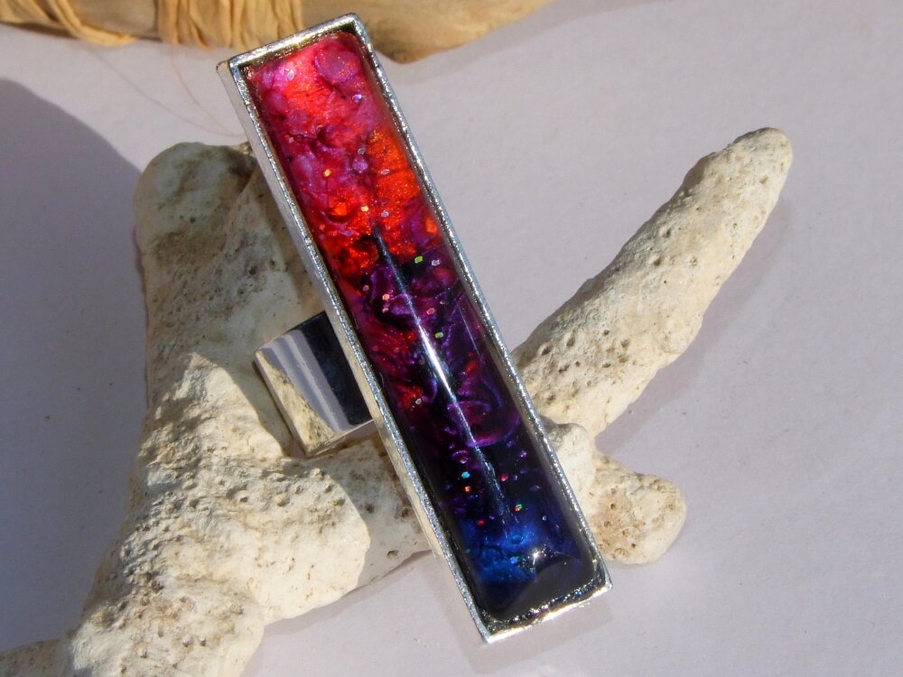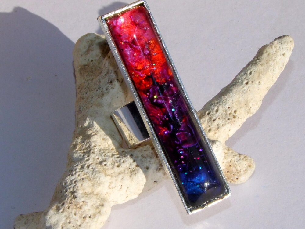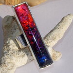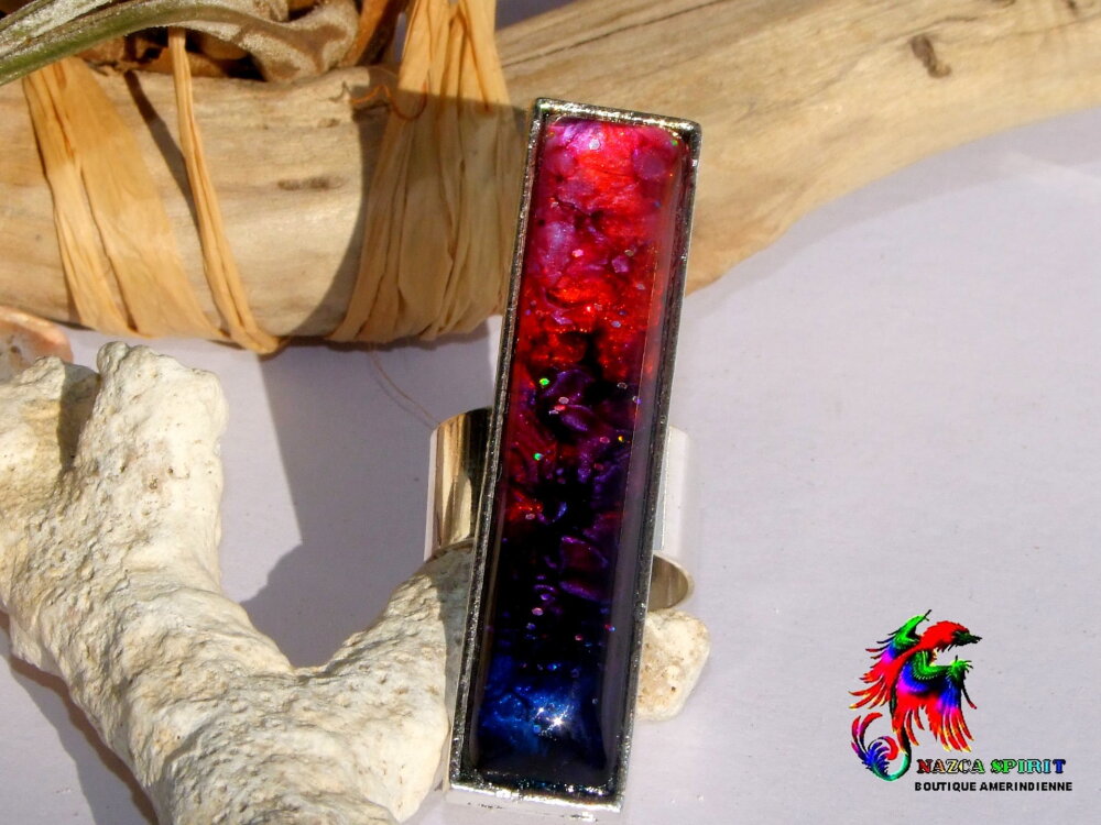 La bague est surmontée d'un très joli cabochon rectangulaire de 5 cm x 1 cm que j'ai coloré à l'aide d'une technique que j'ai inventée et mise au point en 2013 (Technique brevetée et protégée par la propriété intellectuelle).