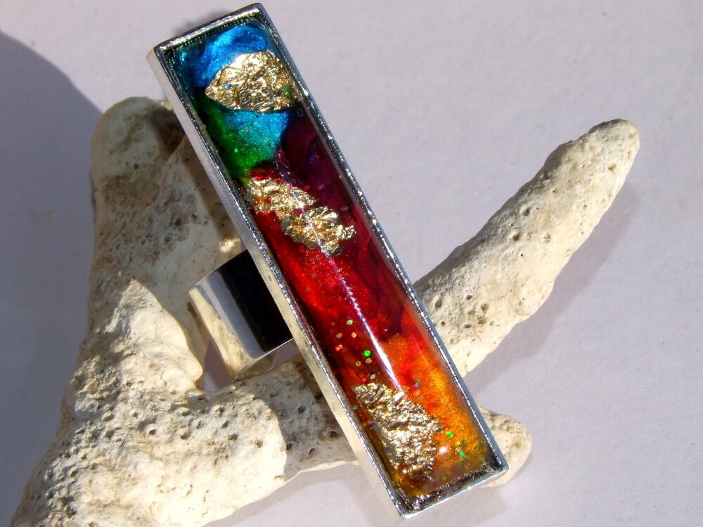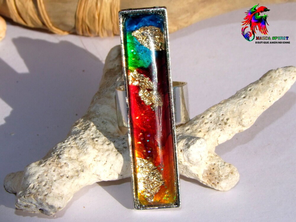 La bague est surmontée d'un très joli cabochon rectangulaire de 5 cm x 1 cm que j'ai coloré à l'aide d'une technique que j'ai inventée et mise au point en 2013 (Technique brevetée et protégée par la propriété intellectuelle).