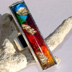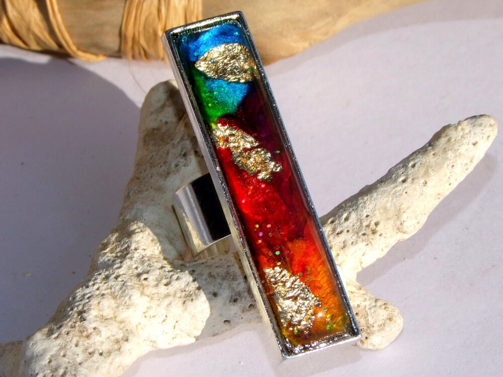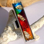 Laissez-vous transporter par ces couleurs puissantes et envoûtantes multicolores...Les feuilles d'or apportent une touche précieuse et encore plus lumineuse au cabochon. Un véritable petit bout d'arc-en-ciel parsemé d'or sur l'un de vos doigts.