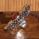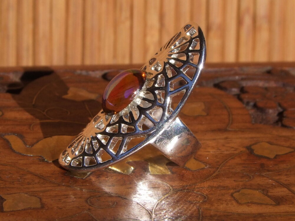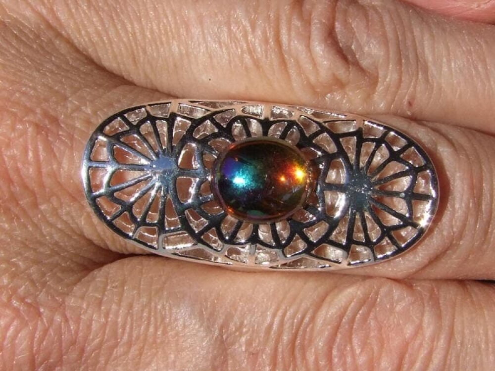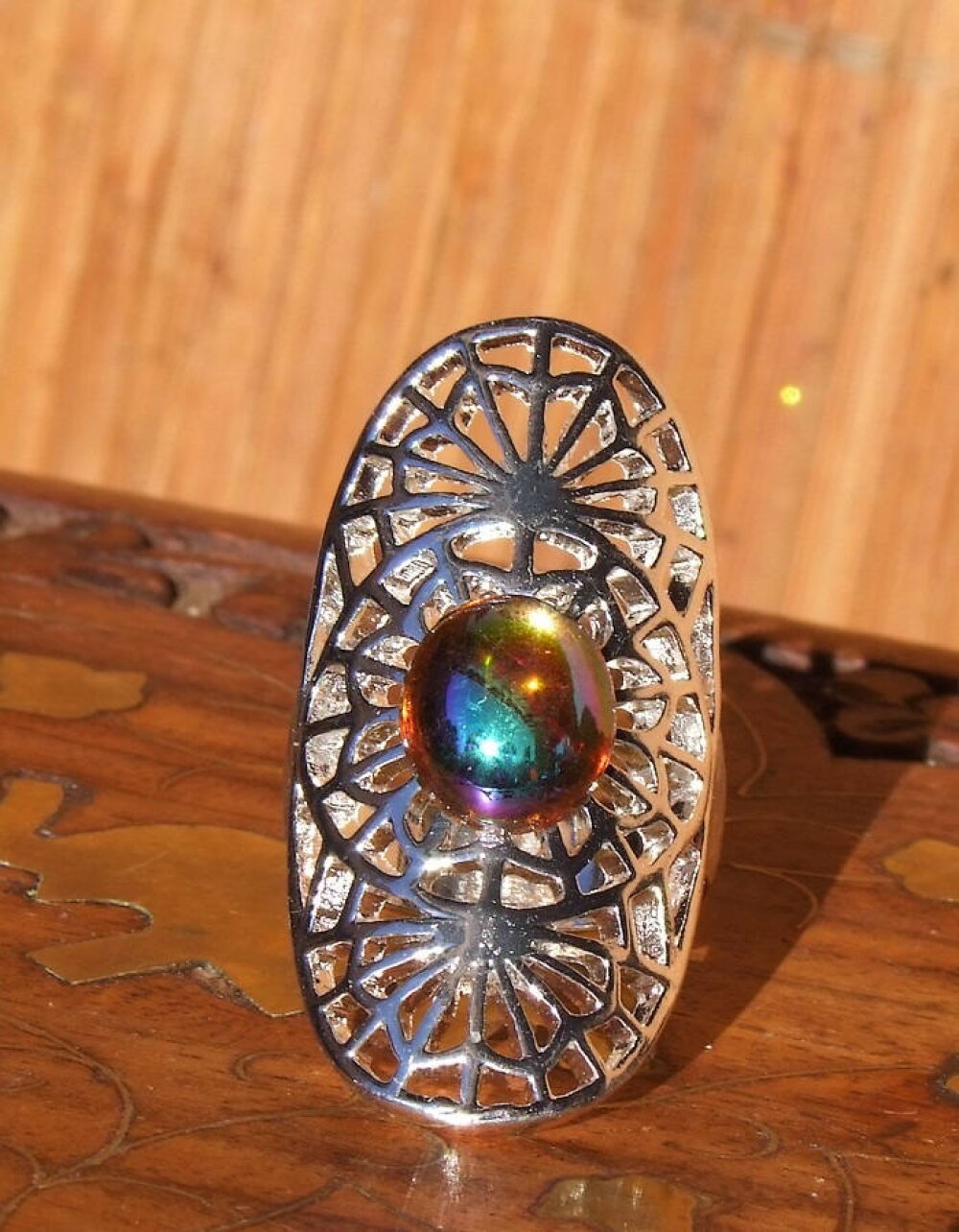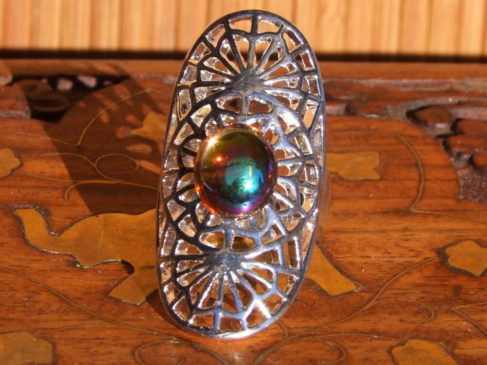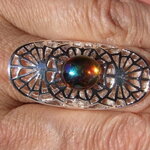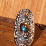 J'ai surmonté la bague d'un superbe cabochon RARE de forme ovale en cristal Swarovski de la Gamme Vintage couleur "aurore boréale" de 13 mm x 11 mm.