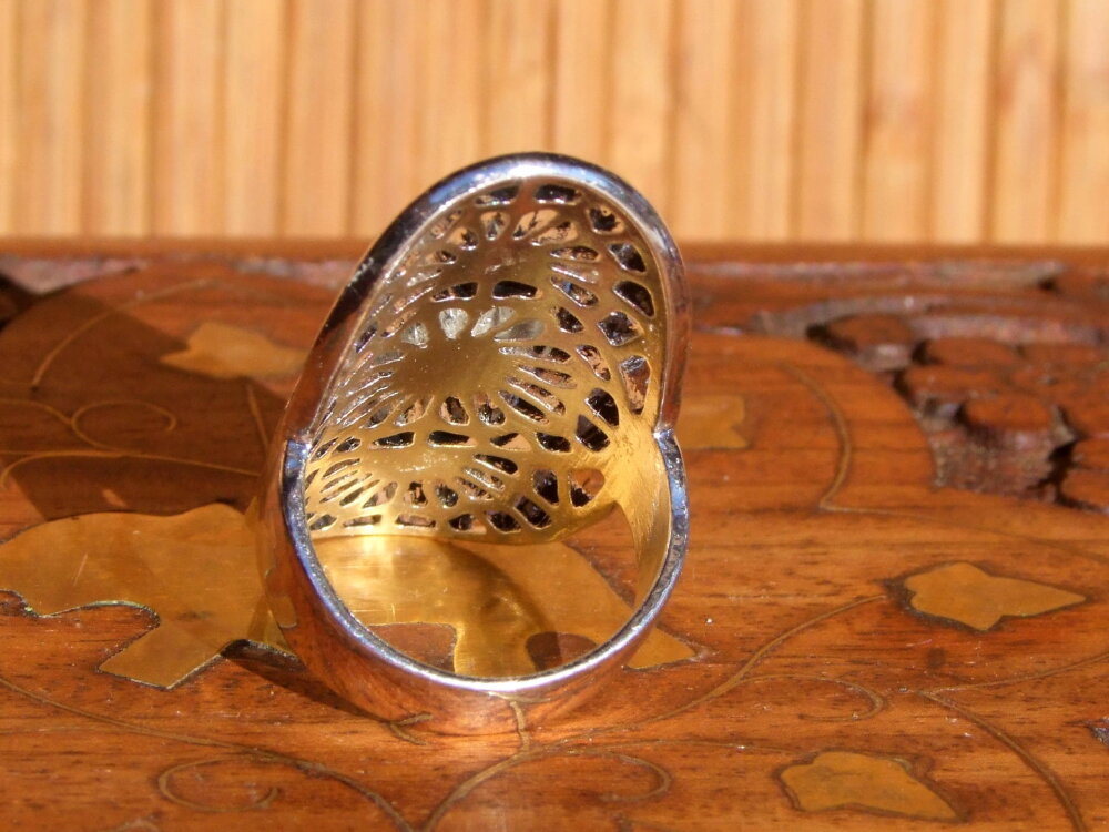 Bague Taille 57 (18.14 mm de diamètre) en alliage de métal couleur argent brillant. La bague est superbement ouvragée, agrémentée de jolis motifs filigranés de style Vintage.