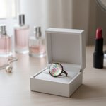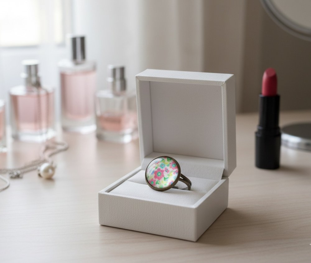 Bague anneaux bronze réglables avec un cabochon verre 16 mm imprimé motifs fleurs multicolores