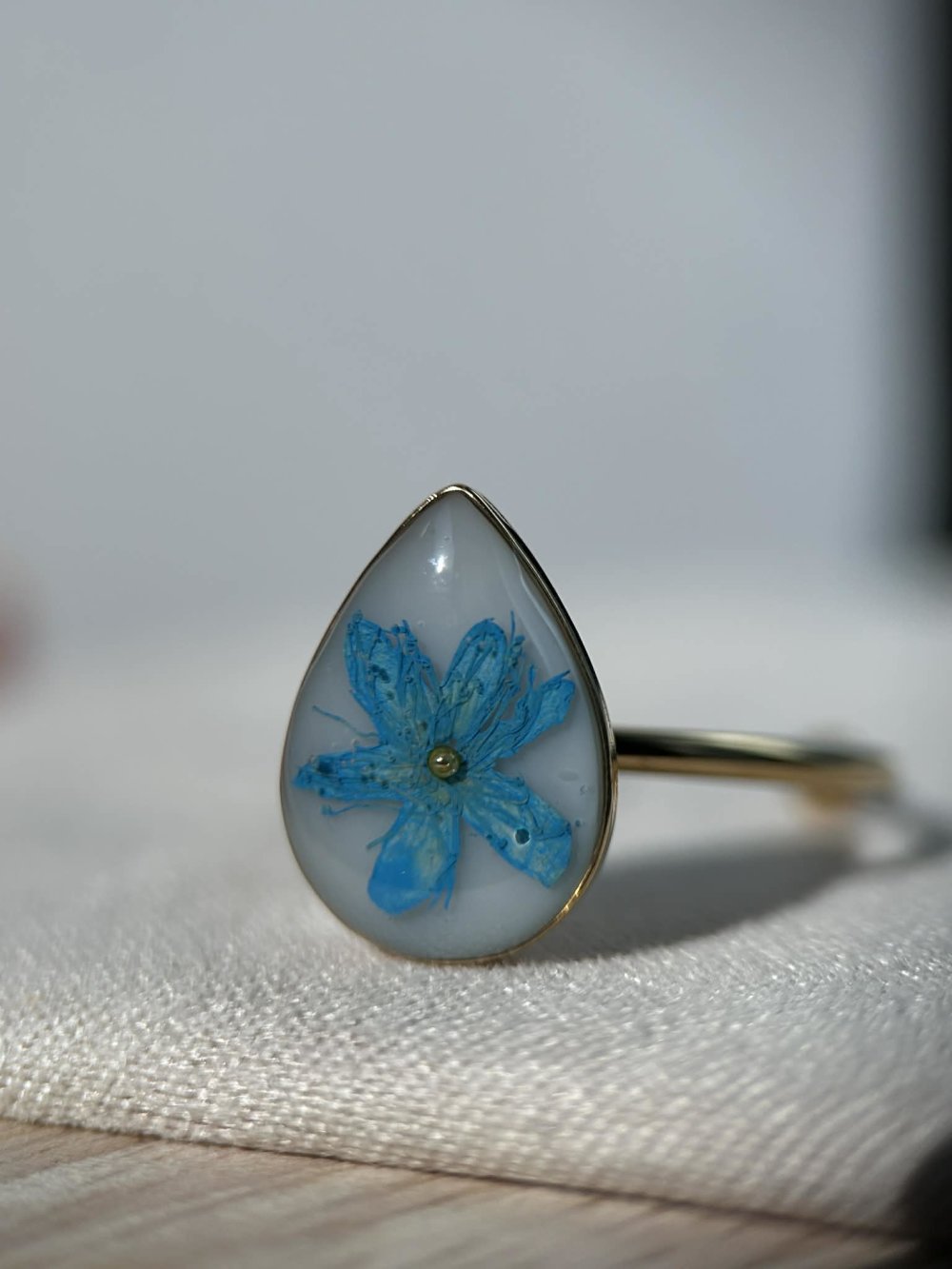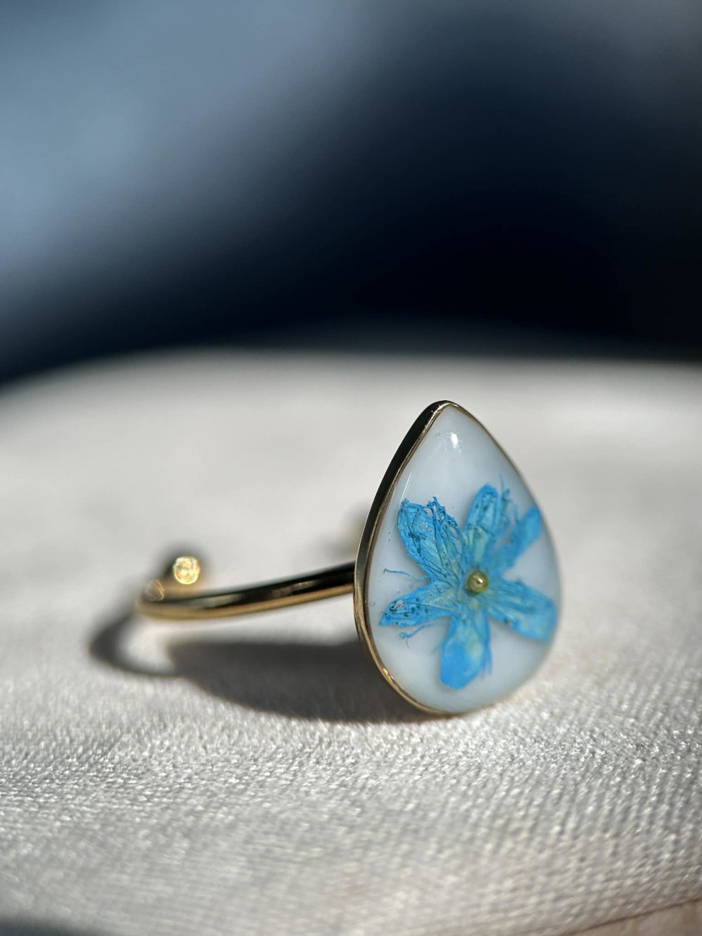Tous les bijoux sont fabriqués en acier inoxydable, en résine et en fleurs naturelles séchées.