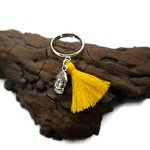 Bague réglable agrémente d'une tête de Bouddha argentée et d'un petit pompon jaune (possibilité de changer la couleur du pompon en me contactant)