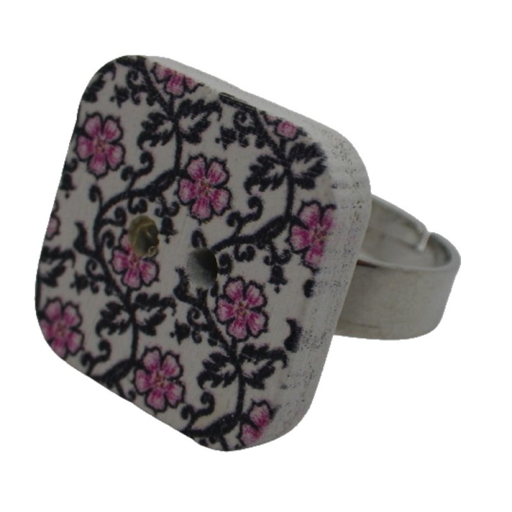 Bague bouton carré en bois fleurs roses et noires