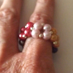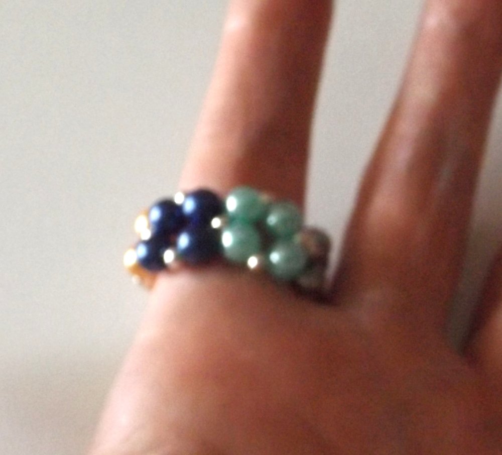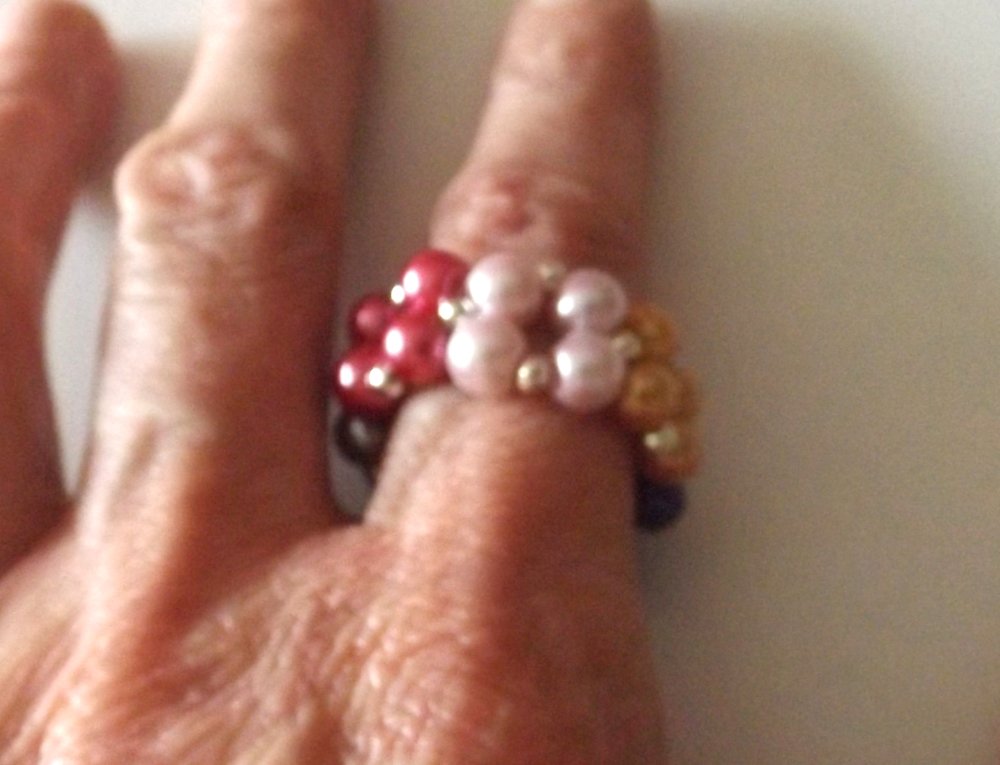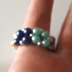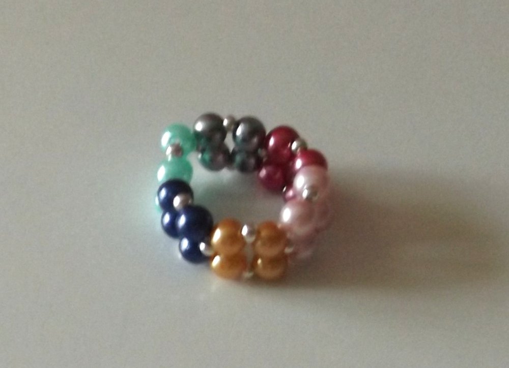 Très jolie bague composée de perles en verre multicolores et perles argentées en acrylique.