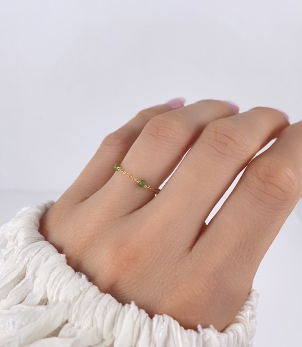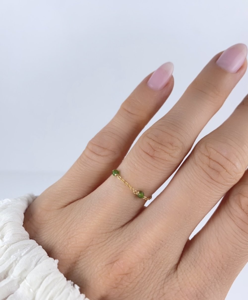 Bague fine en chaîne d'or laminé 14k et diopside - bague chaînette minimaliste