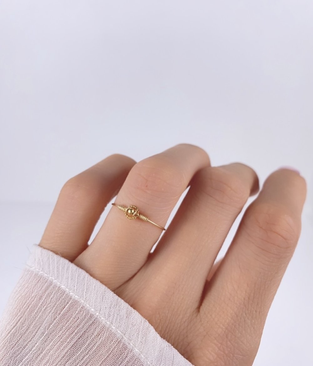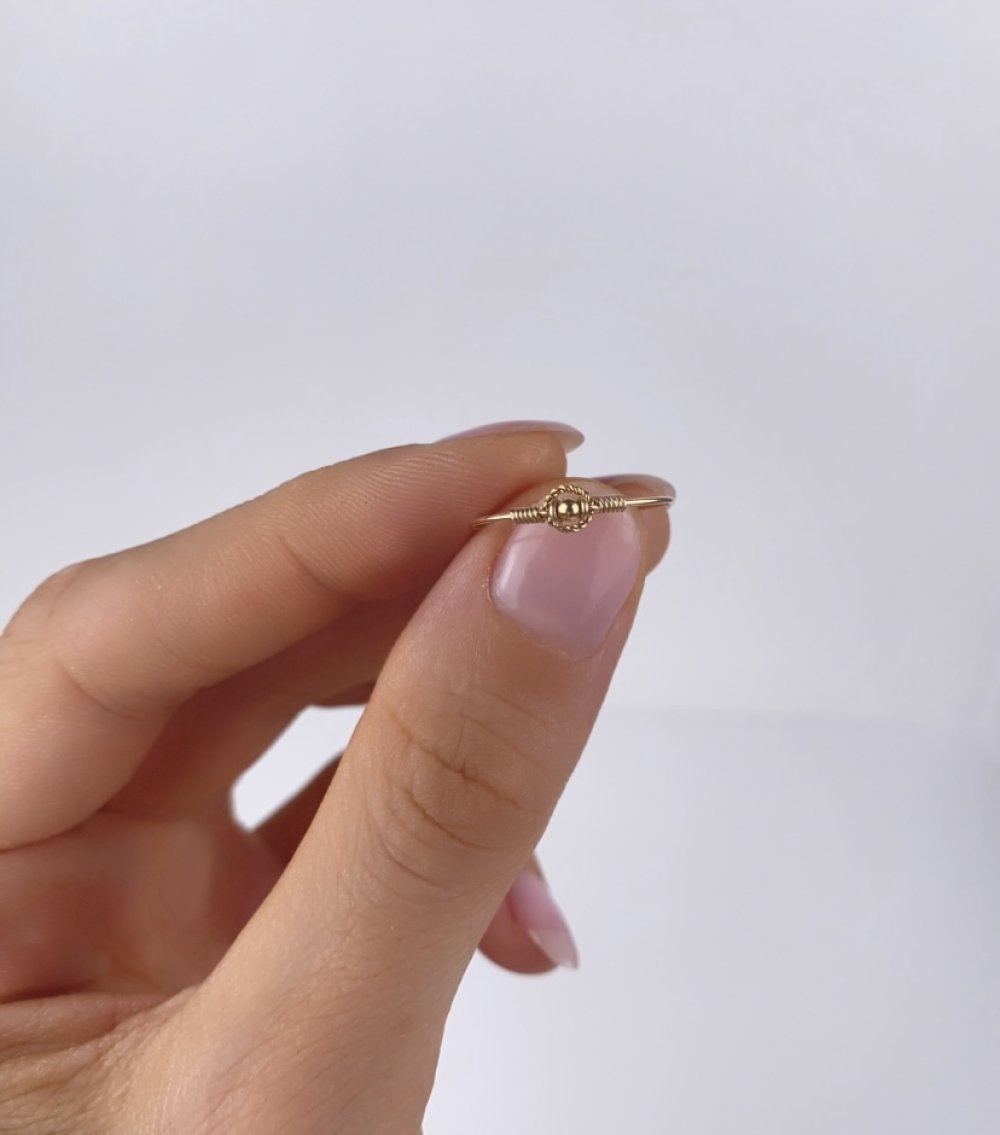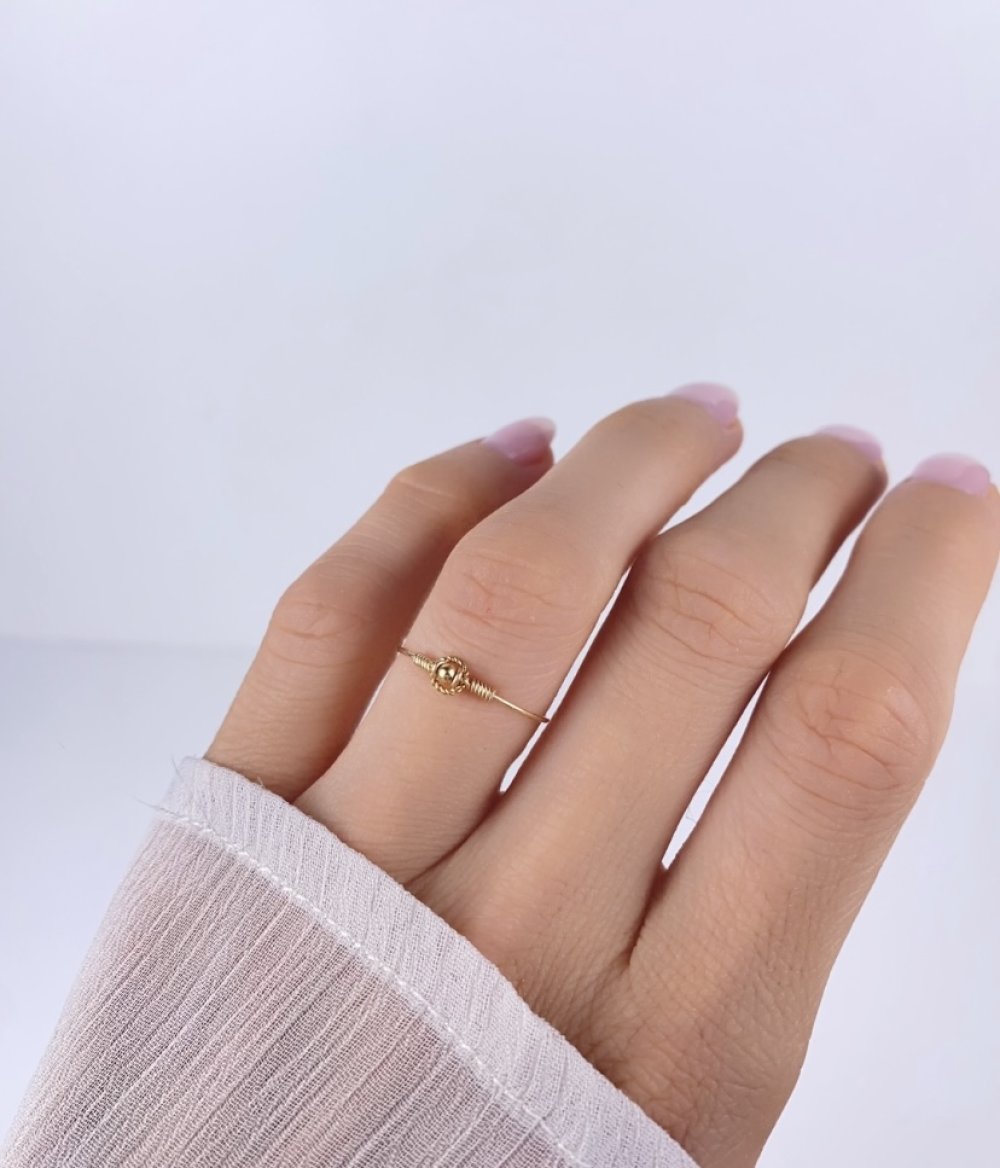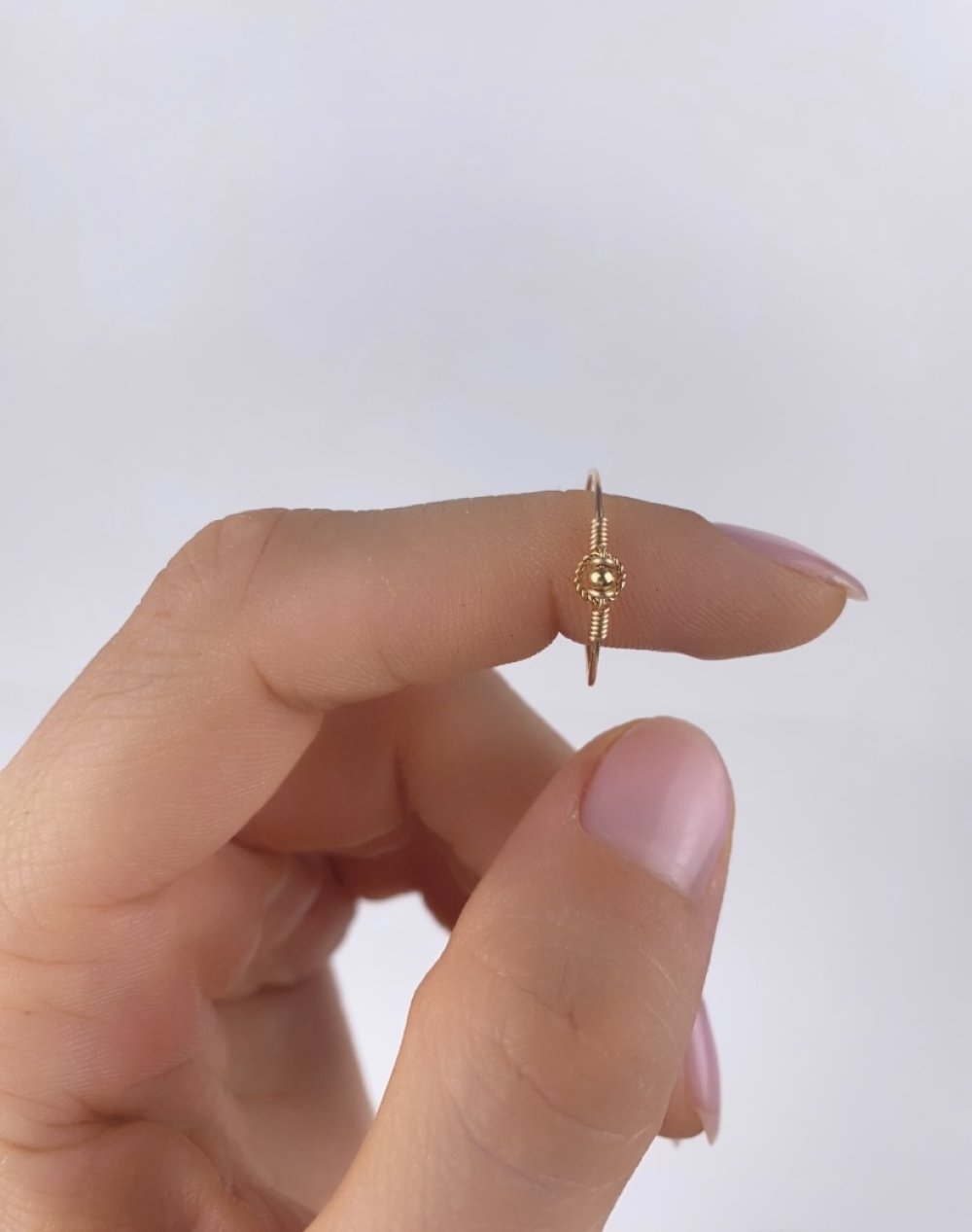 Simple et raffinée, la bague Nox est entièrement façonnée à la main au câble d’or laminé 14k. Elle se distingue par un petit anneau martelé orné d’une perle d’or, qui capte la lumière avec subtilité.