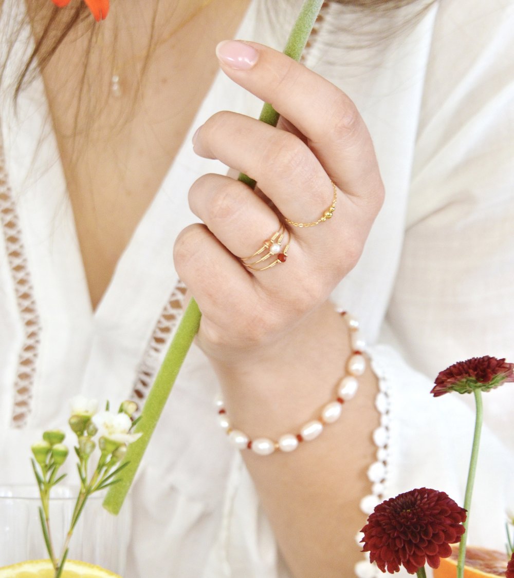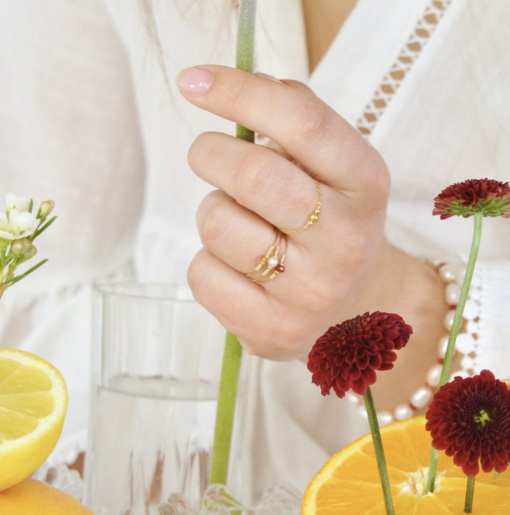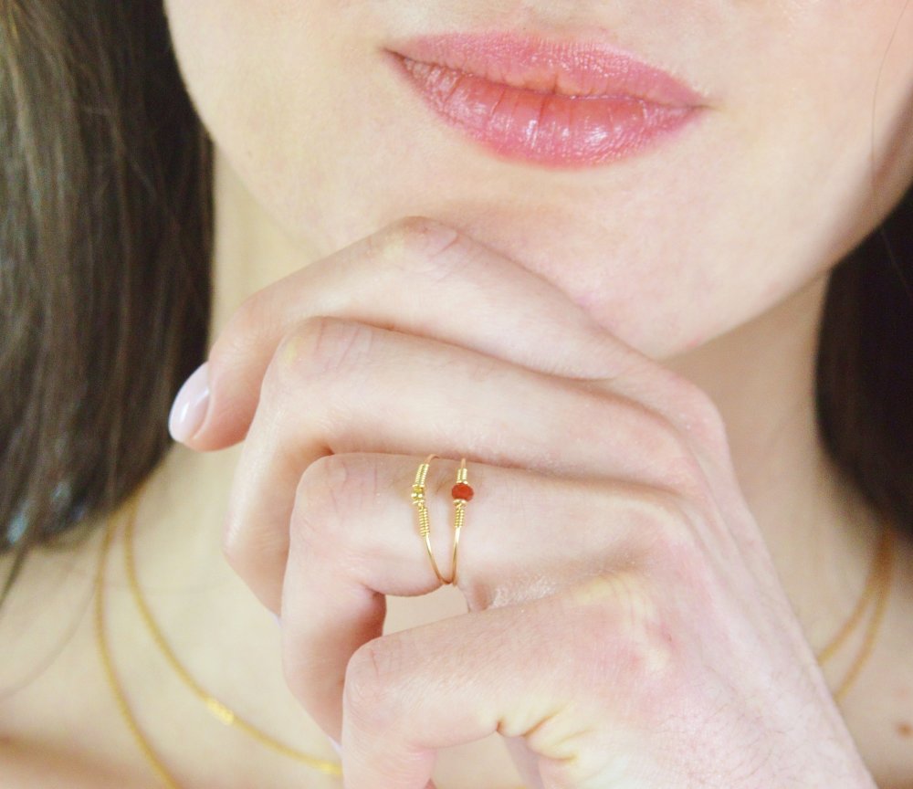 🌿 La bague Mila est entièrement réalisée à la main au fil d’or laminé. Elle est sertie d’une petite cornaline aux reflets chauds, pour une touche discrète et lumineuse. Un bijou minimaliste, facile à porter seul ou en accumulation.