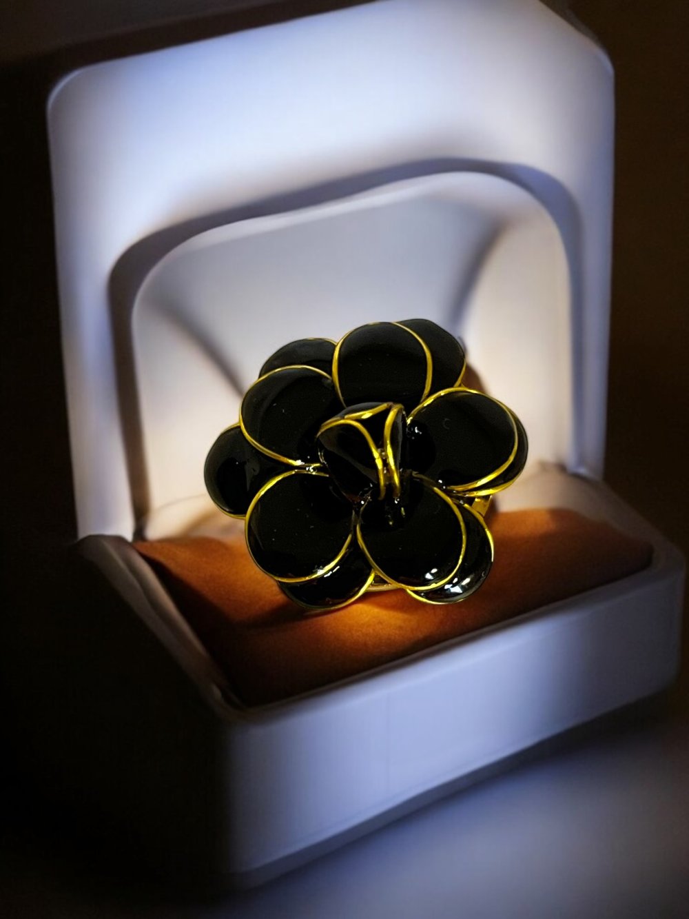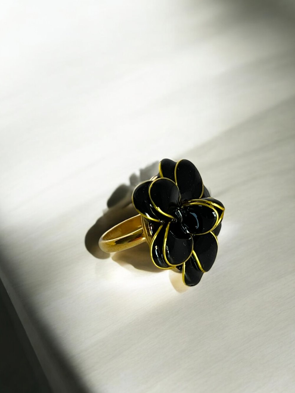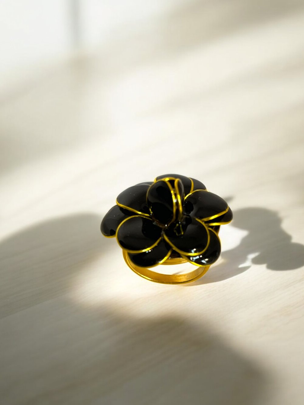 Bague fleur noire et or, chic et sculpturale. Chaque pétale est façonné et doré à la main pour un rendu raffiné et audacieux. Taille ajustable, légère et confortable, idéale pour sublimer une tenue élégante ou minimaliste.