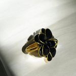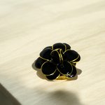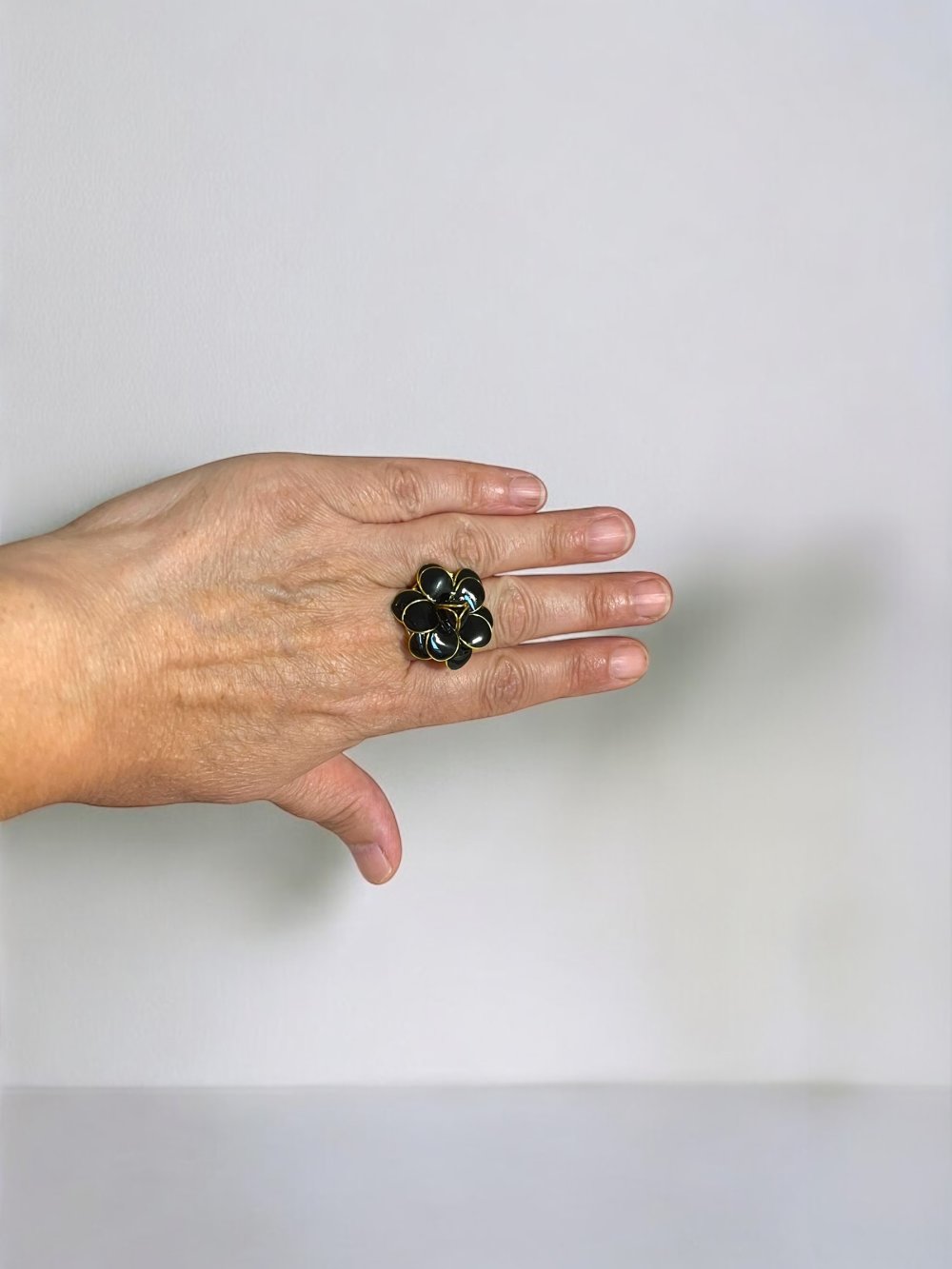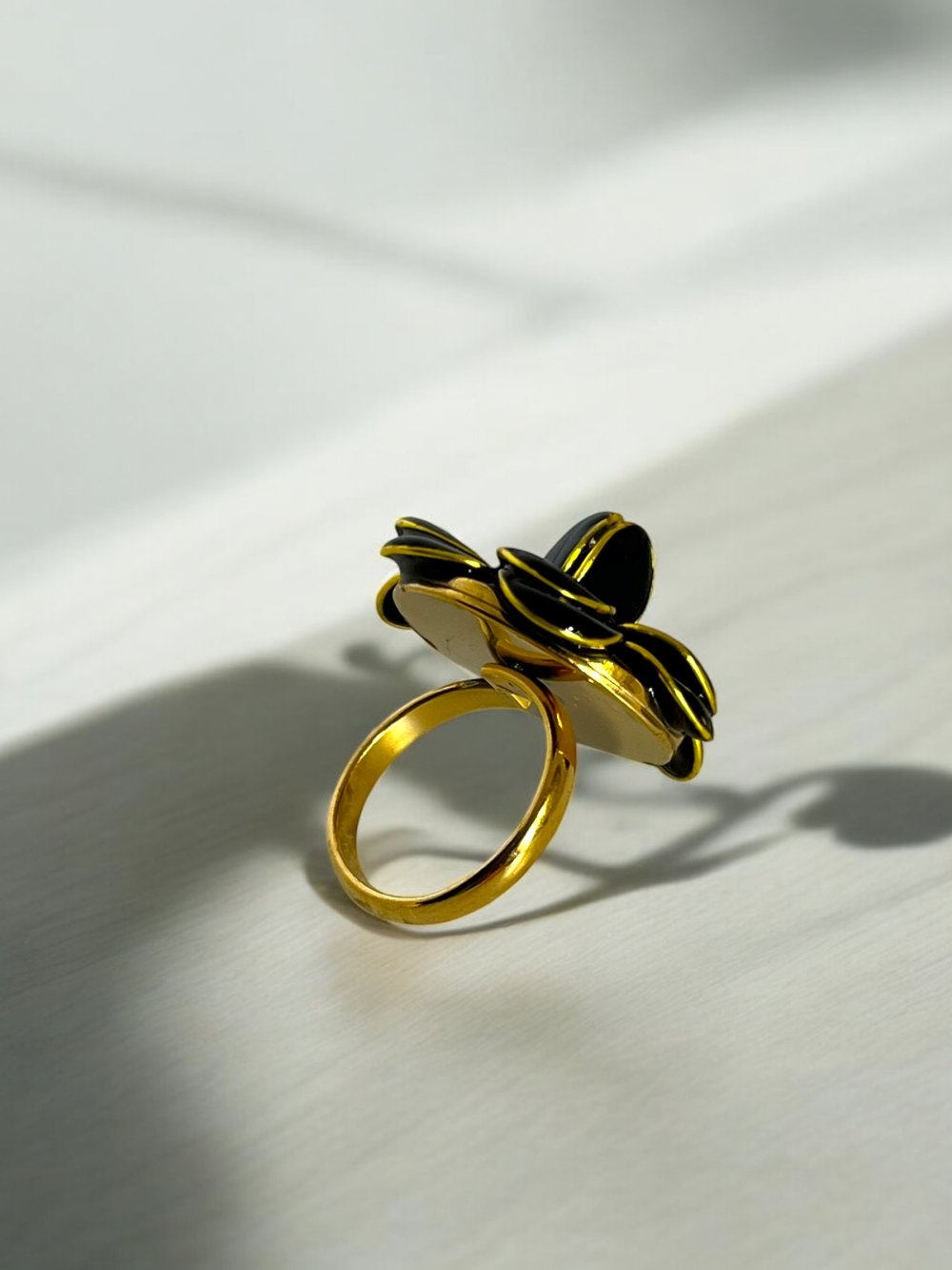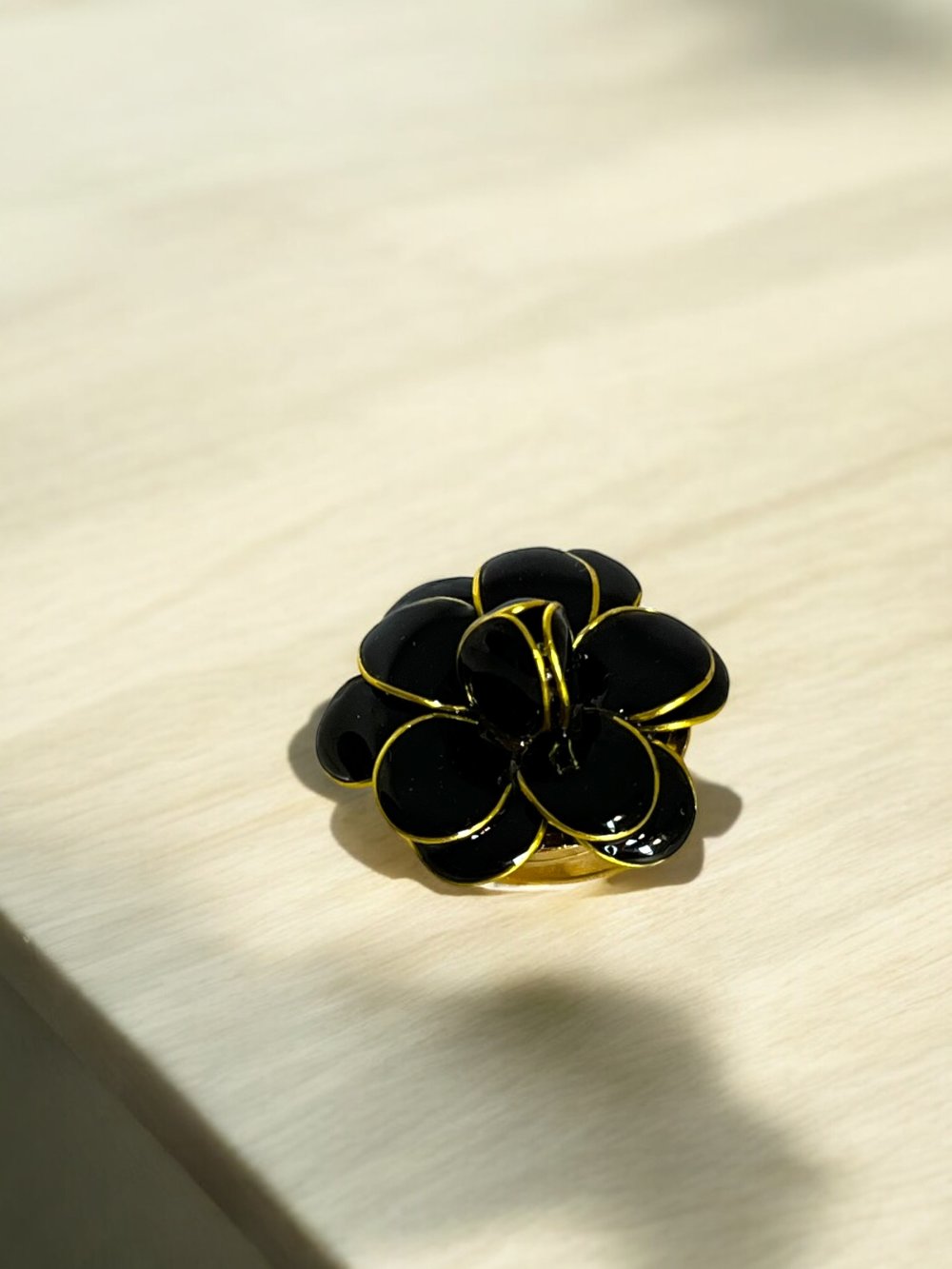 Bague fleur noire et or, chic et sculpturale. Chaque pétale est façonné et doré à la main pour un rendu raffiné et audacieux. Taille ajustable, légère et confortable, idéale pour sublimer une tenue élégante ou minimaliste.